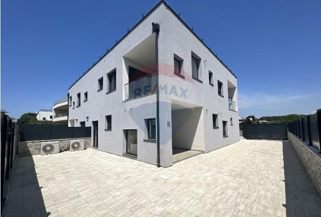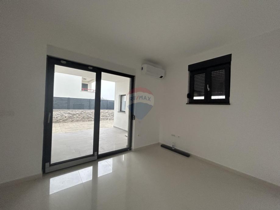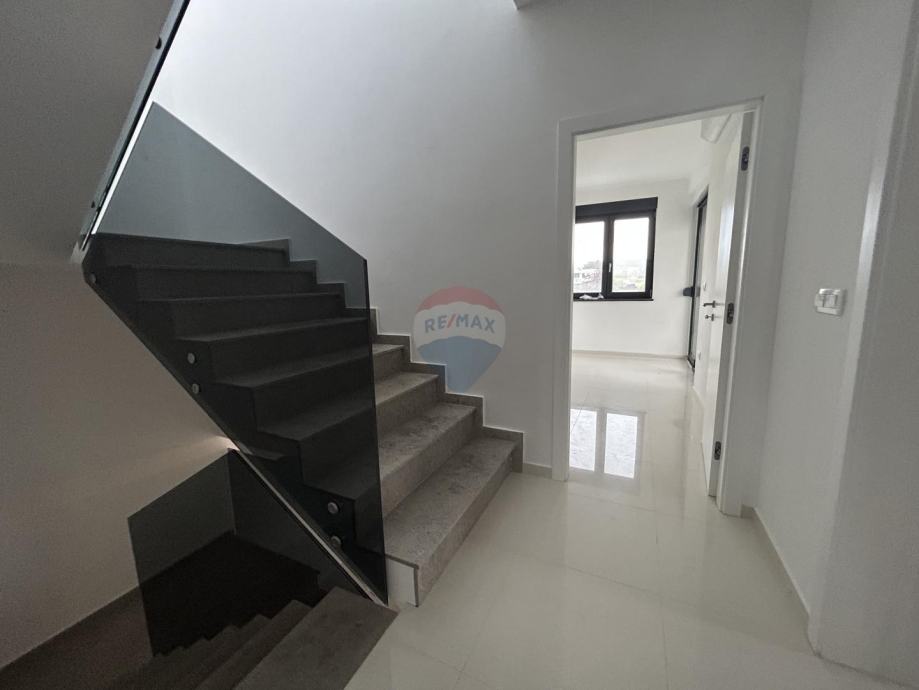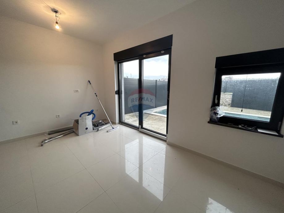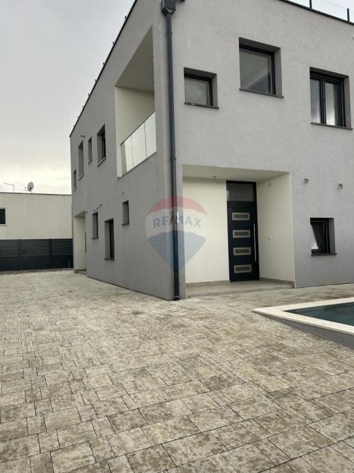 Na prodaju je lijepa moderna kuća s krovnom terasom i bazenom. Kuća se nalazi na dobroj i atraktivnoj lokaciji na samo 500 m od centra i mora. Sastoji se od natkrivenog ulaza, hodnika, 4 kupaonice, dnevnog boravka, kuhinje s blagovaonicom, 4 spavaće sobe, 3 natkrivene terase i velike krovne terase. Kuća ima 2 parkirna mjesta, bazen i vrt. Na 10 minuta nalaze se dućani, restorani i ljekarna.