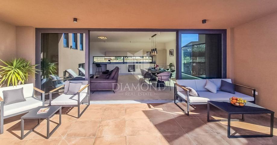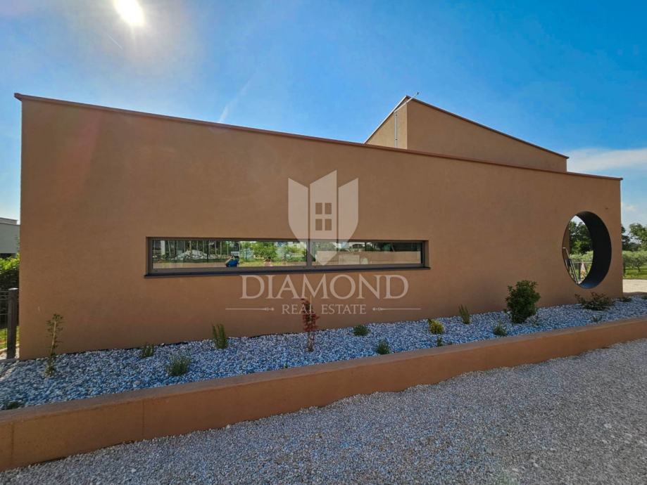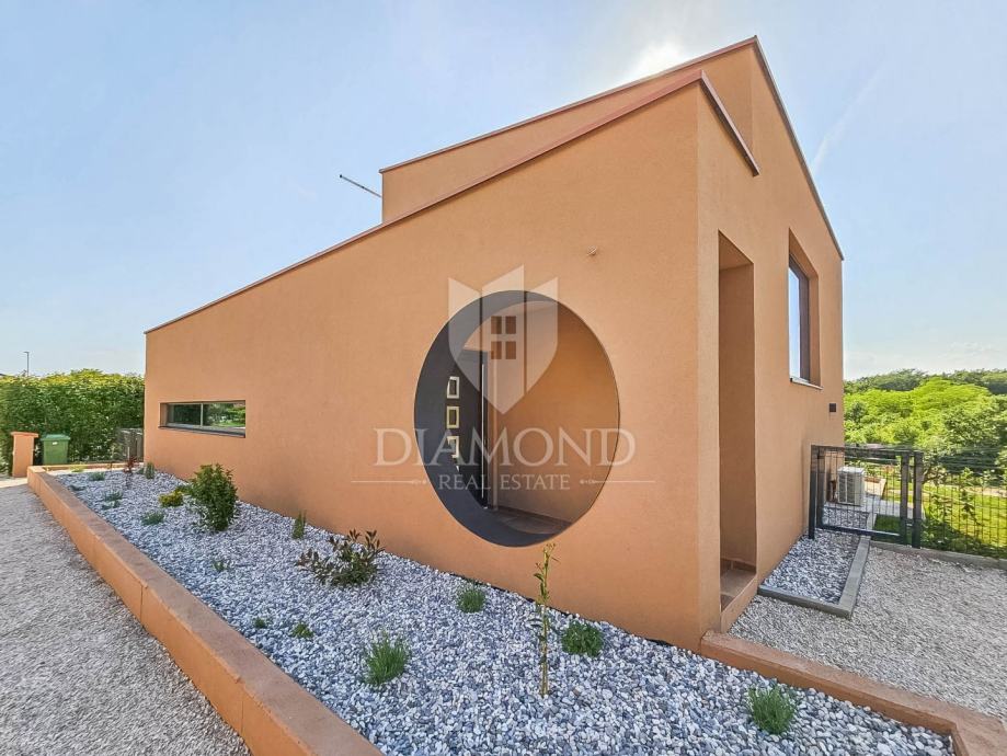 Novigrad, vila modernog dizajna od 136m2 na zemljištu od 925m2 s tri spavaće sobe, bazenom i pogledom na more nalazi se u blizini grada Novigrada, samo 2,5 km od centra i prekrasnih plaža.