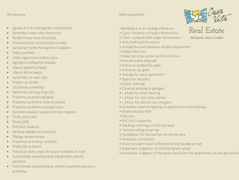 • PODOVI: u spavaćim sobama obloga hrastovim parketom I. klase a u ostatku stana, sanitarnim čvorovima, loggiama i terasama u prizemlju velikoformatnim keramičkim pločicama I. klase