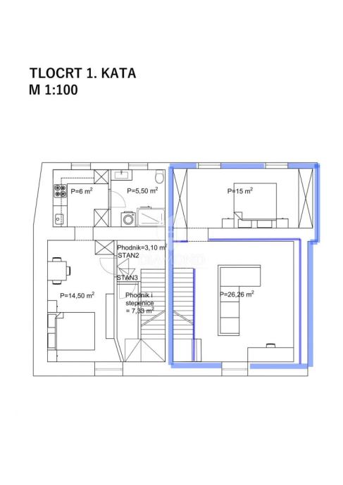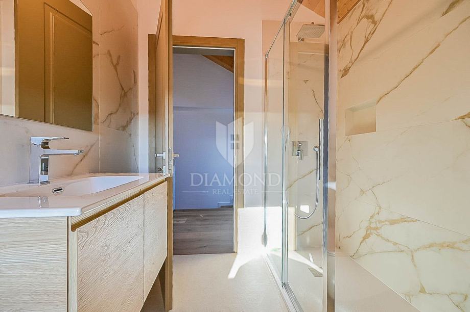 Kat iznad pruža topli dnevni boravak s izlazom na balkon te 1 prostranu spavaću sobu. Na drugoj etaži smještena je druga spavaća soba s kupaonicom, dok treći kat nudi još jednu spavaću sobu s pripadajućom kupaonicom i dodatnim hodnikom. Svaka prostorija odiše pažljivo biranim detaljima, a prozori otvaraju pogled prema moru i okolnoj prirodi. Na svakoj etaži ugrađena je unutarnja jedinica klimatizacijskog sustava, četiri unutarnje i dvije vanjske jedinice. Opskrba toplom vodom osigurana je s dva električna bojlera.