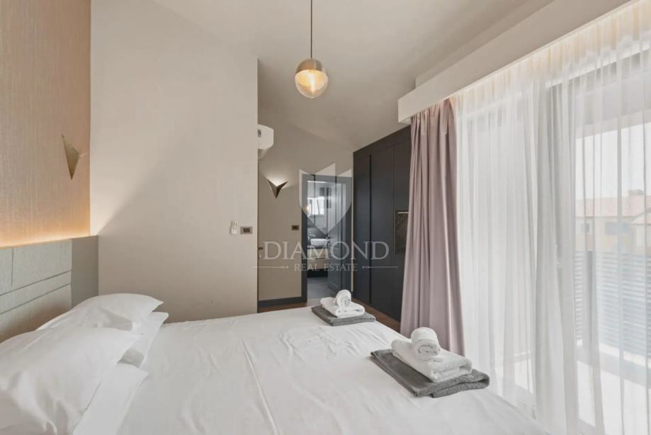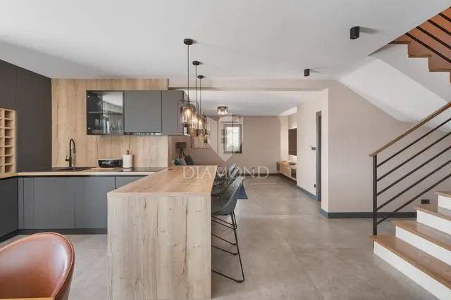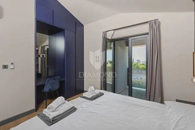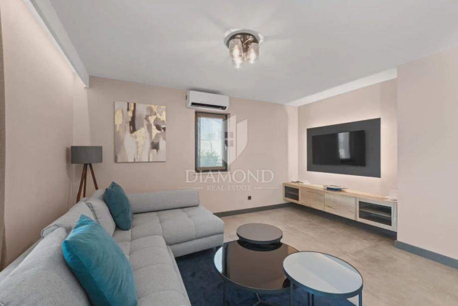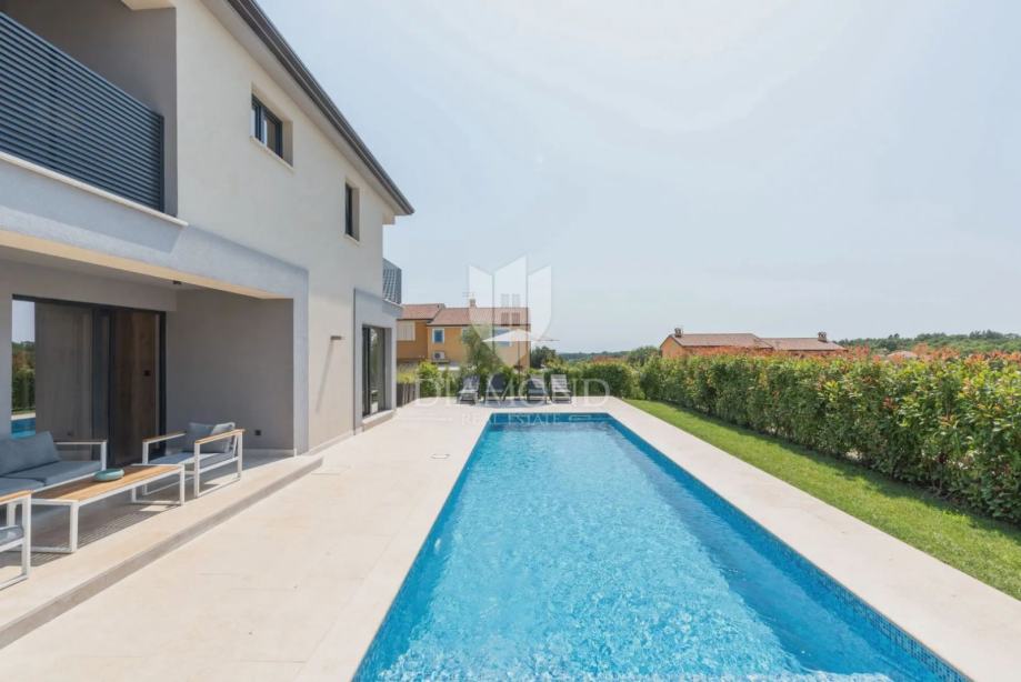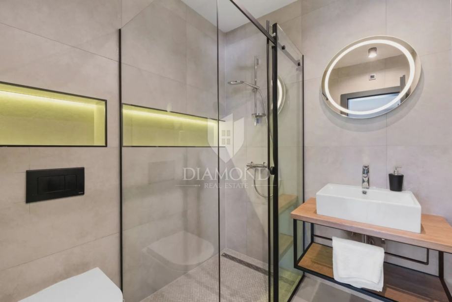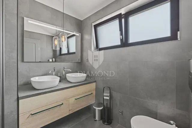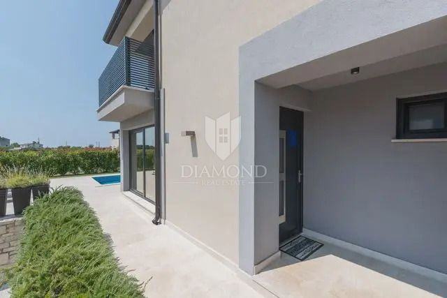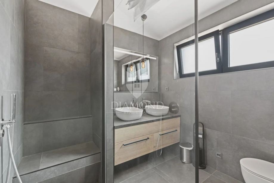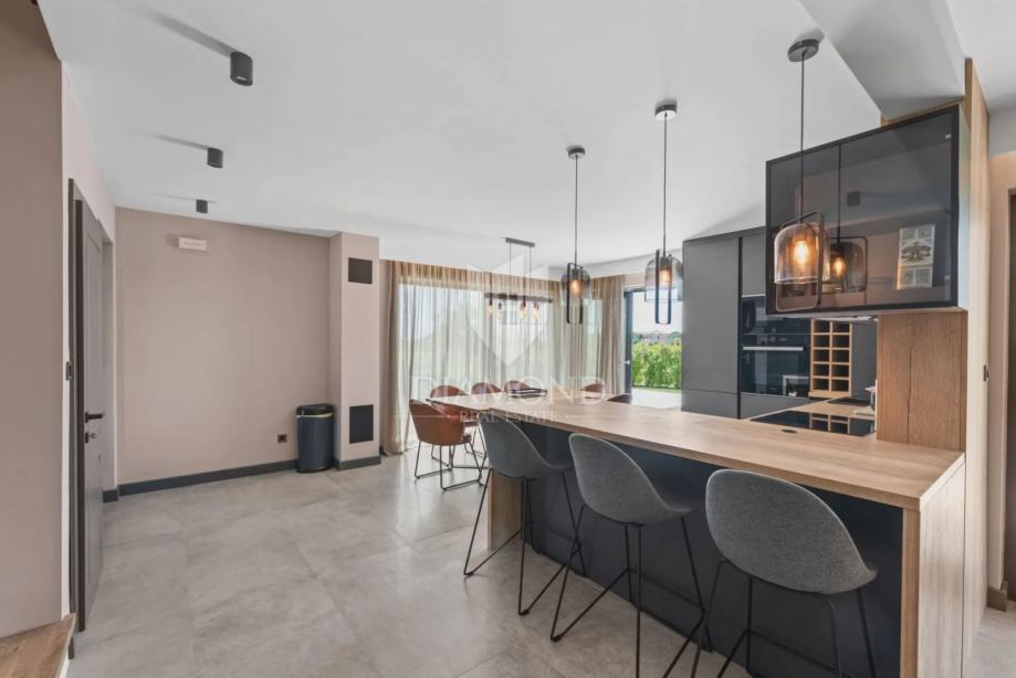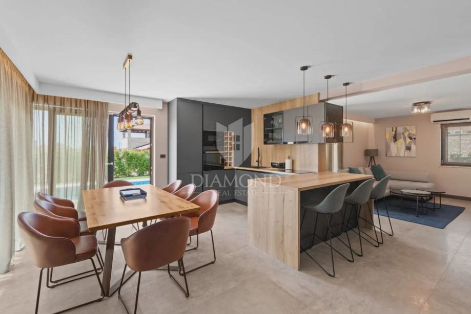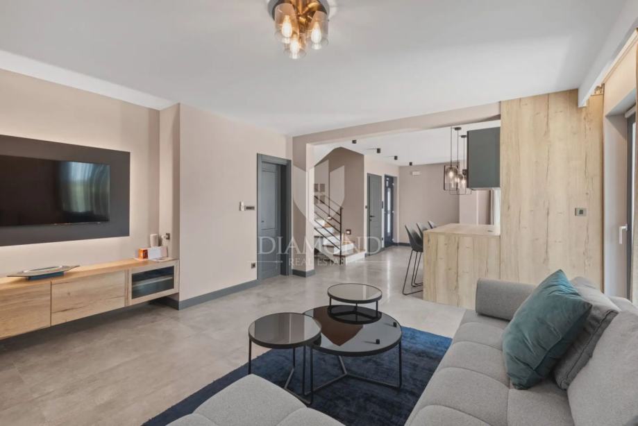 Kuća se proteže na dvije etaže. U prizemlju se nalazi prostrani dnevni boravak s kuhinjom i blagovaonicom otvorenog tipa, ostava, praonica i kupaonica. Iz dnevnog boravka se izlazi na terasu s koje se pristupa uređenoj okućnici, bazenu, sunčalištu i kupalištu. Na kat se pristupa unutarnjim stepenicama na kojem se nalazi kupaonica i 3 spavaće sobe, od kojih je jedan master spavaća soba s vlastitom kupaonicom i terasom.