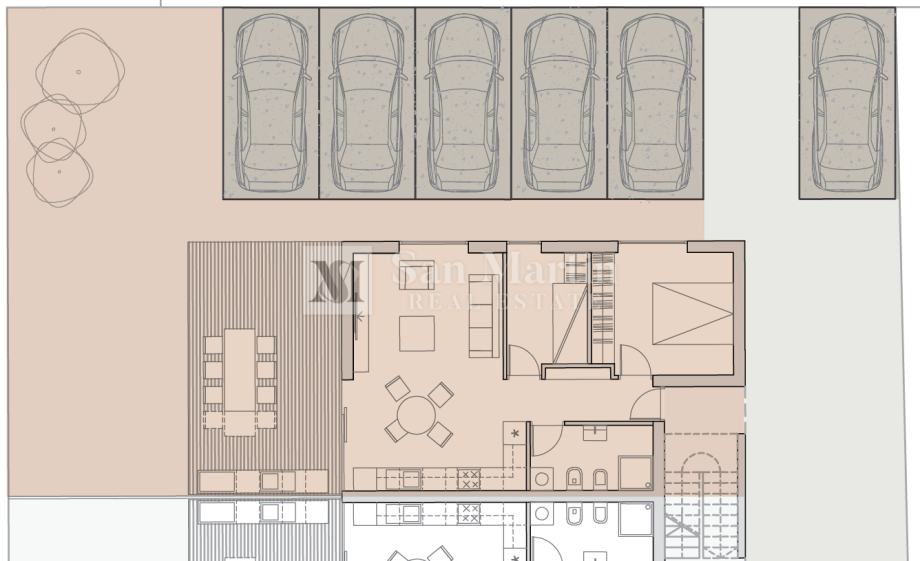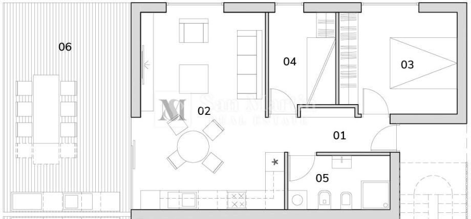 Stan se nalazi u prizemlju zgrade sa 3 stan a i sastoji se od dnevnog boravka sa kuhinjom i blagovaonom open-space koncepta, spavaće soba, kupatila i vanjske terase od 26,30 m2. Stan ima 80,55 m2 i vrt od 79,25 m2. Pripadaju mu 2 parkirna mjesta.