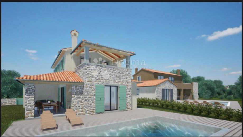 U prostranom dvorištu smješten je elegantan bazen površine 32 m², okružen sunčalištem i zelenilom, dok je parkirni prostor osiguran za nekoliko automobila. Grijanje je predviđeno putem električnog podnog sustava kroz cijeli objekt, a vanjska fasada bit će obložena prirodnim kamenom, što kući daje dodatnu notu elegancije i autentičnosti. U dogovoru s investitorom budući kupac ima mogućnost personalizirati interijer, odabirom podnih obloga i završnih materijala prema vlastitim željama i stilu.