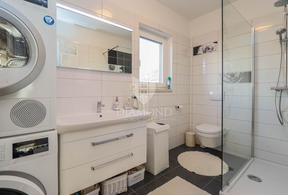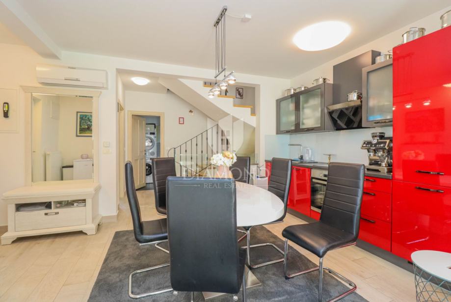 Kuća se prostire na ukupno 3 etaže a ukupna površina kuće iznosi 130 m2. U prizemlju se nalazi dnevni boravak sa kuhinjom i blagovaonicom otvorenog tipa, 1 spavaća soba i kupaonica. Iz dnevnog boravka se izlazi na terasu s izlazom na okućnicu. Unutarnjim stepenicama pristupa se na kat gdje su smještene još 2 spavaće sobe, svaka sa svojom kupaonicom, hodnik i terasa. U suterenu se nalazi i prostor s kotlovnicom i spremištem koje je idealno i za sva druženja ili može poslužiti kao mirna poslovna soba. Sustav grijanja je na radijatore a hlađenja na klima uređaje. Kuća se prodaje potpuno opremljena modernim namještajem.