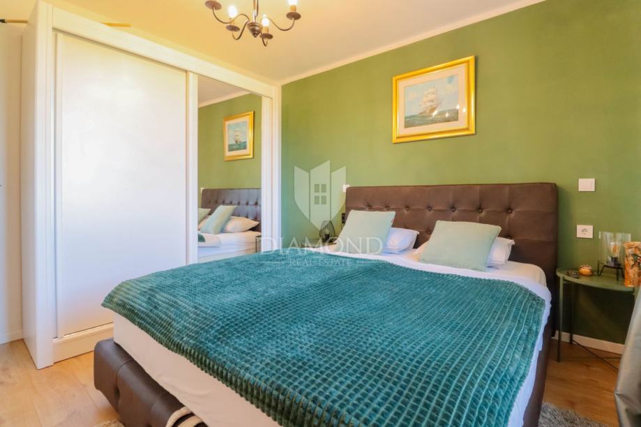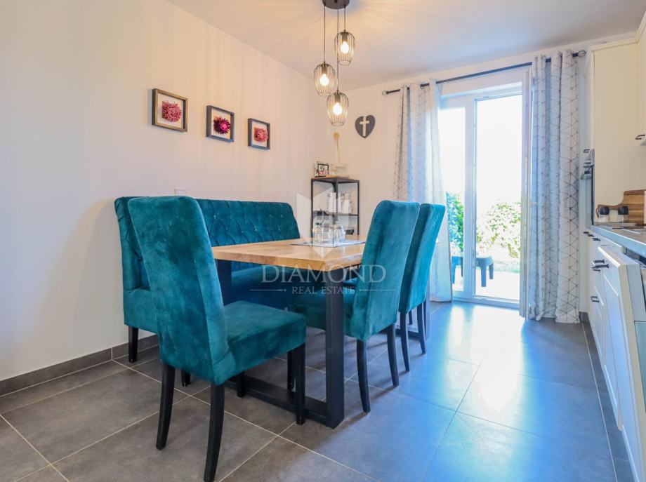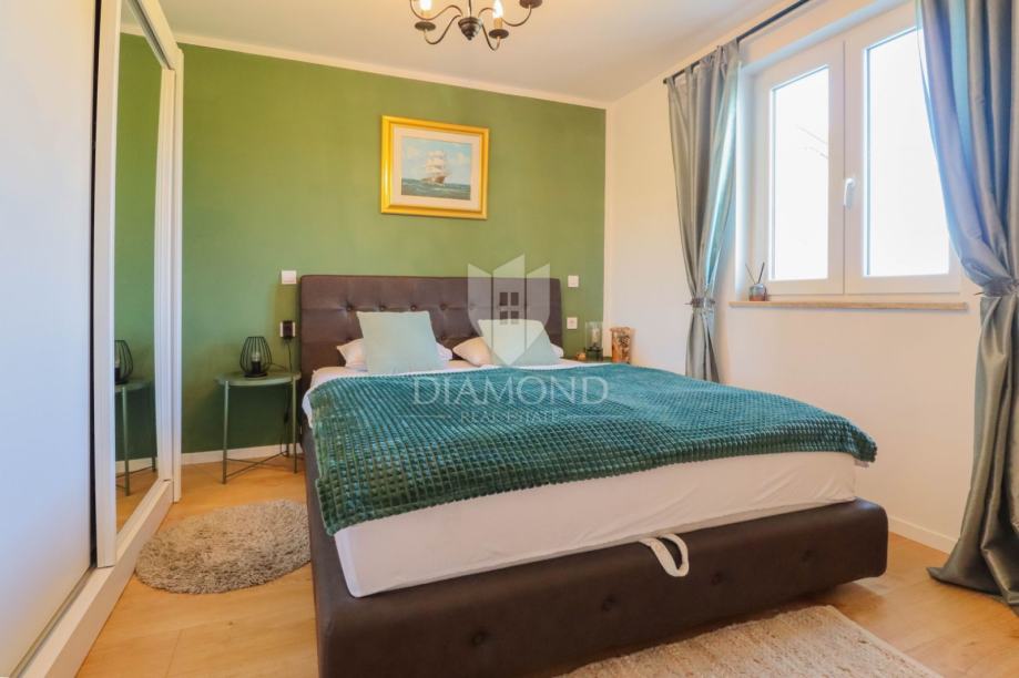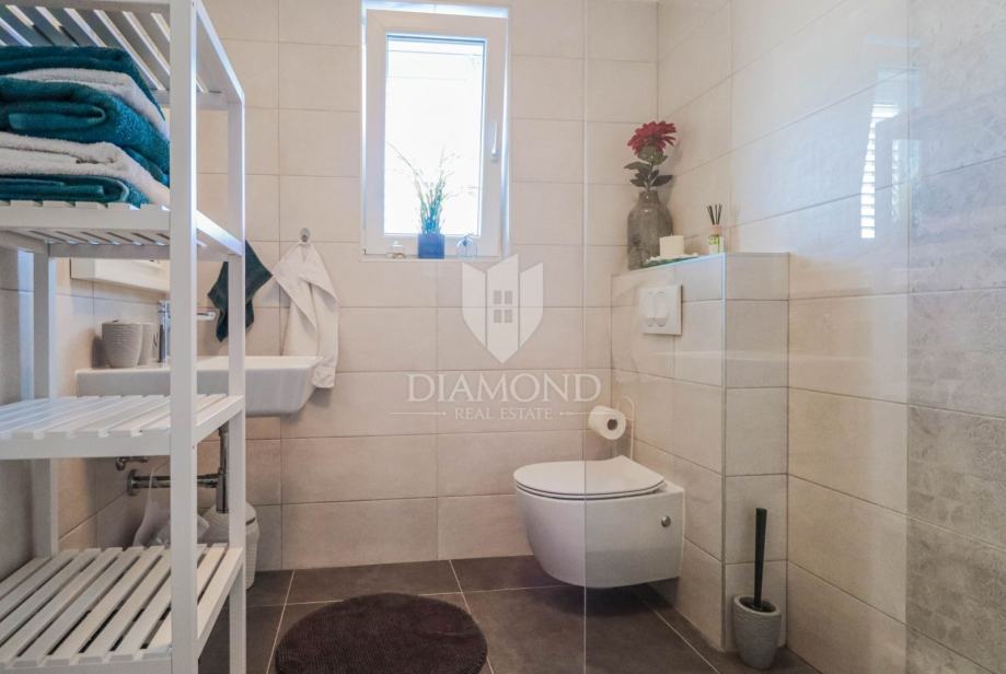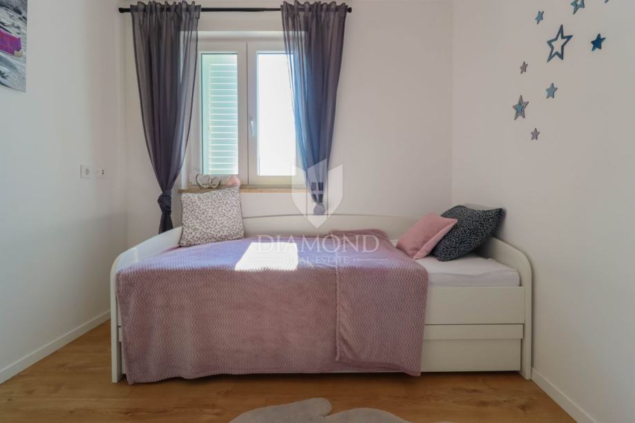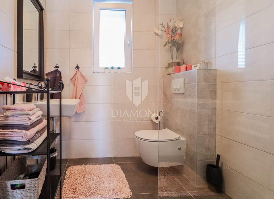 Ukupna površina kuće 84 m2, a proteže se na dvije etaže. U prizemlju kuće nalazi se dnevni boravak sa kuhinjom i blagovaonicom otvorenog tipa, kupaonica i dvije terase. Jedna terasa je natkrivena a iz druge se izlazi u dvorište u kojem je smješten jacuzzi idelan za sva ljetna uživanja. Na prvi kat pristupa se unutarnjim stepenicama na kojem su smješteni kupaonica i 3 spavaće sobe od kojih jedna ima izlaz na terasu sa prekrasnim pogledom na more i zelenilo. Grijanje je na klima uređaje. Kući pripadaju i dva parkirna mjesta, te okućnica površine 70 m2.