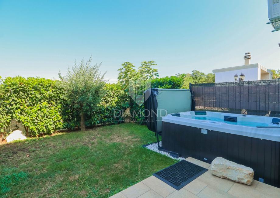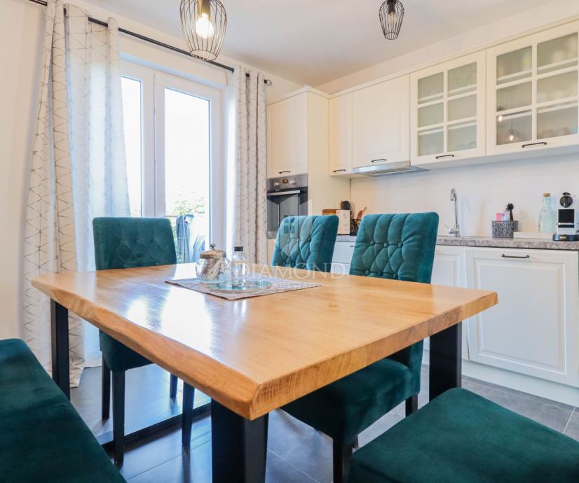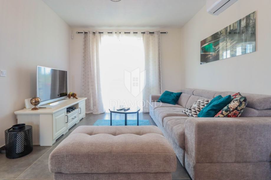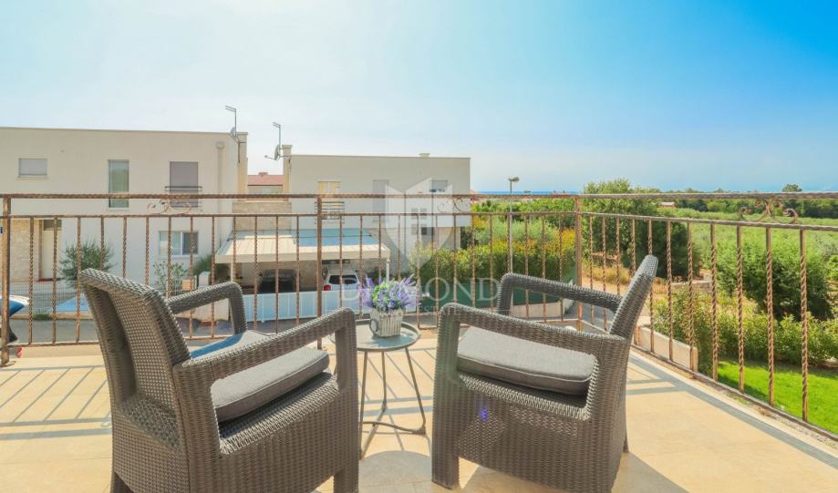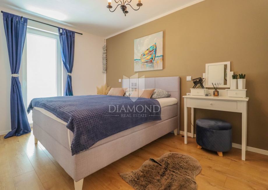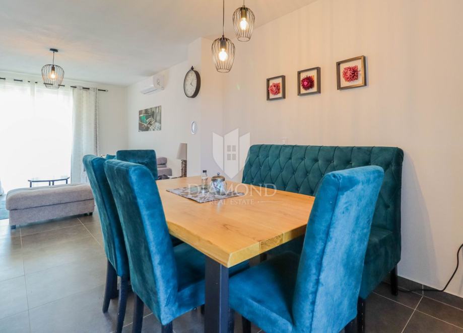 Ukupna površina kuće 84 m2, a proteže se na dvije etaže. U prizemlju kuće nalazi se dnevni boravak sa kuhinjom i blagovaonicom otvorenog tipa, kupaonica i dvije terase. Jedna terasa je natkrivena a iz druge se izlazi u dvorište u kojem je smješten jacuzzi idelan za sva ljetna uživanja. Na prvi kat pristupa se unutarnjim stepenicama na kojem su smješteni kupaonica i 3 spavaće sobe od kojih jedna ima izlaz na terasu sa prekrasnim pogledom na more i zelenilo. Grijanje je na klima uređaje. Kući pripadaju i dva parkirna mjesta, te okućnica površine 70 m2.