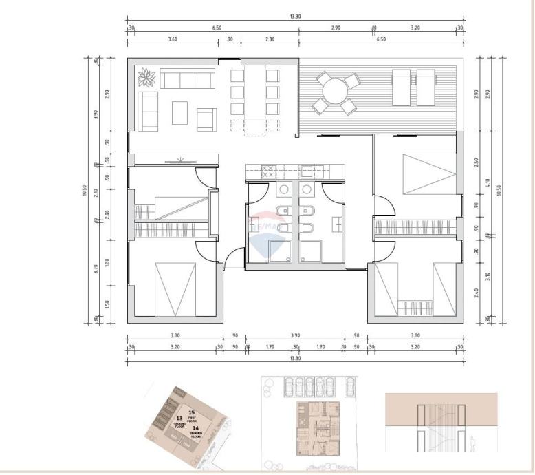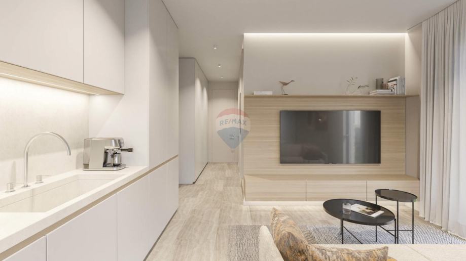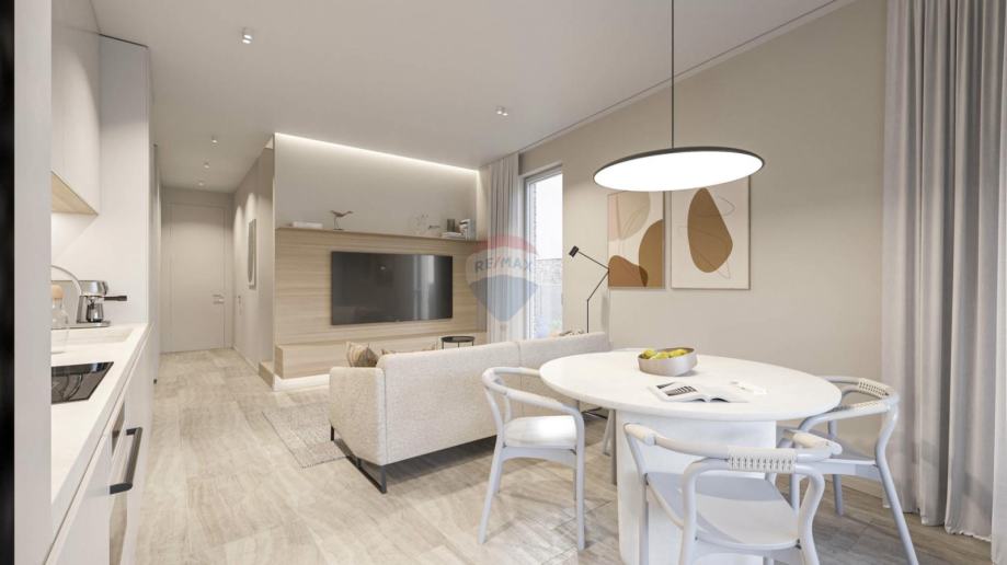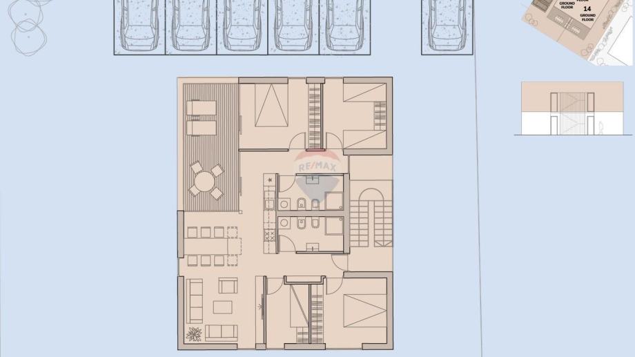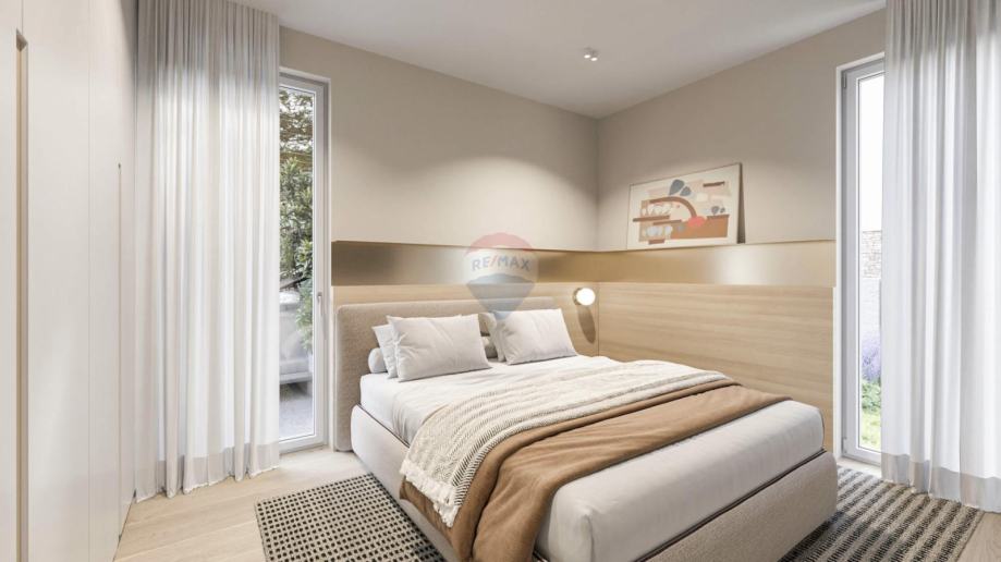 Stan se sastoji od ulaznog hodnika, dnevnog boravka s blagovaonom, kuhinjom, četiri spavaće sobe, dva hodnika, terase i krovne terase.