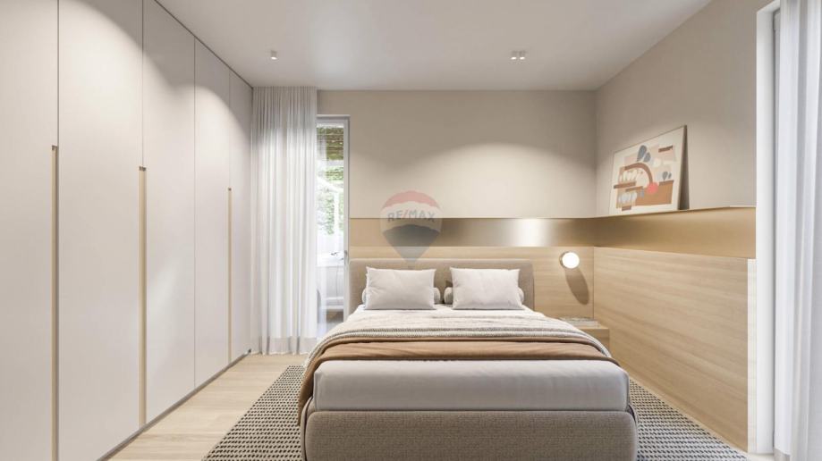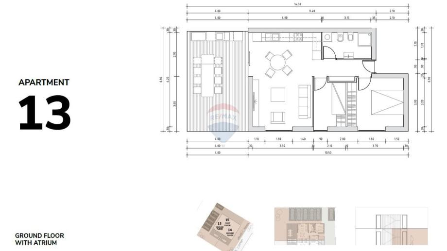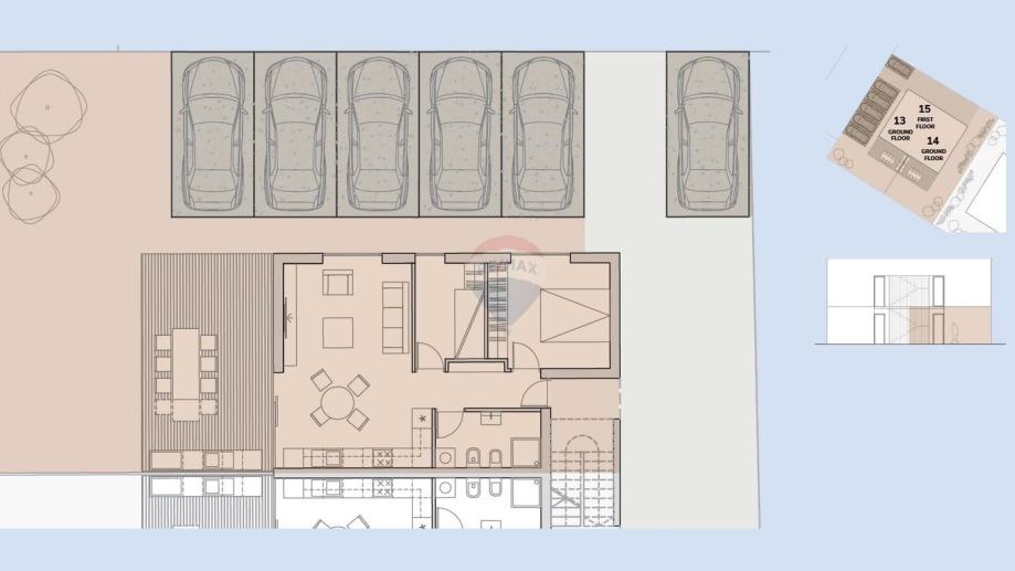 Prizemlje se sastoji od ulaznog hodnika, dnevne sobe, kuhinje, kupaone, dvije spavaće sobe, terase i atrija.