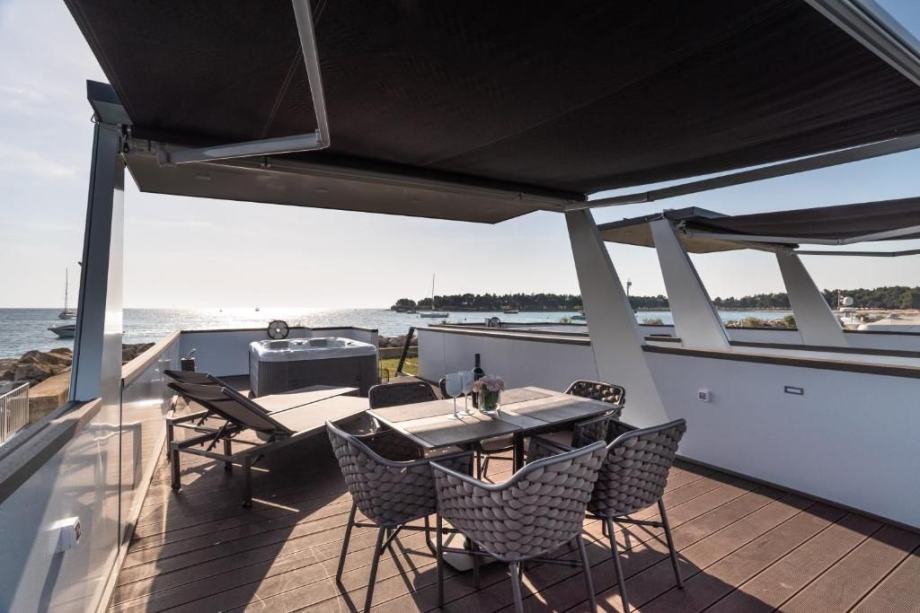 Vanjske stepenice vode do krovne terase koja je opremljena jacuzzijem.Sa terase se pruža predivan pogled na Novigrad i more .