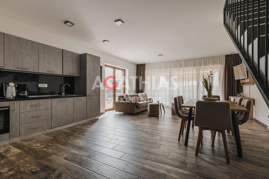 Stan je vrhunski opremljen, klimatiziran, kategoriziran za turistički najam i prodaje se potpuno namješten, što omogućuje trenutno useljenje ili početak iznajmljivanja bez dodatnih ulaganja. Kvalitetna gradnja uključuje vrhunsku termo i zvučnu izolaciju, dok je hortikulturno uređenje okućnice pažljivo osmišljeno s autohtonim biljem i stablima koje dodatno oplemenjuju ambijent.