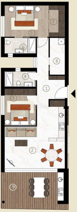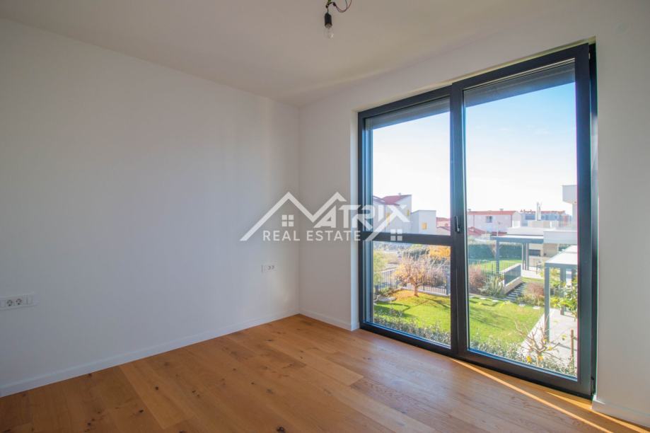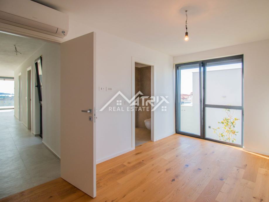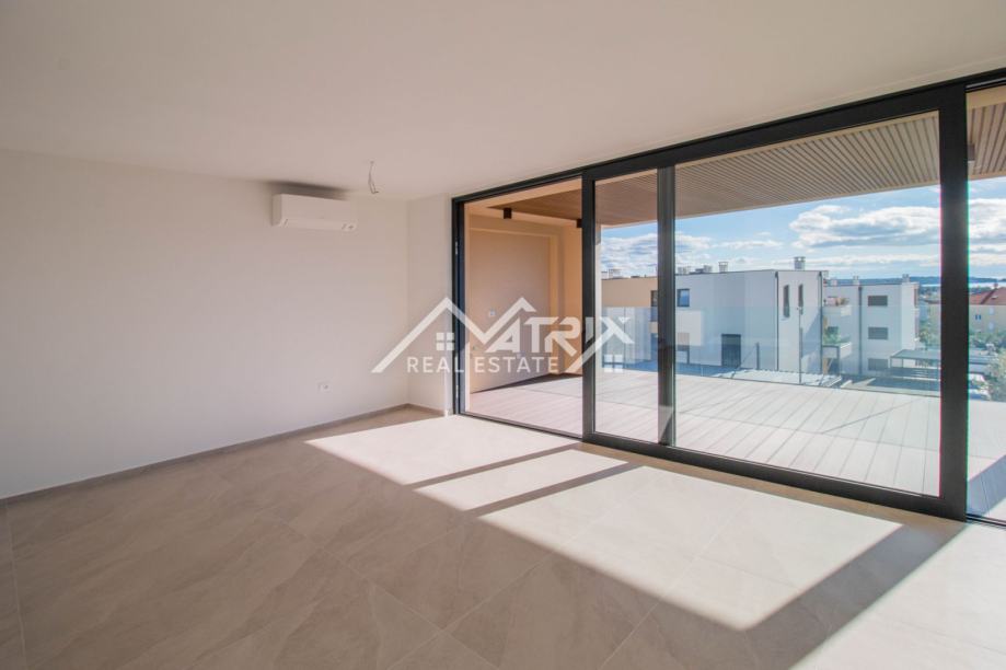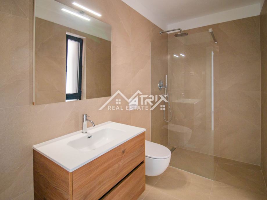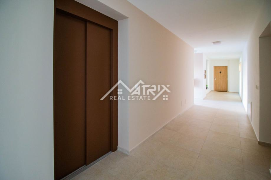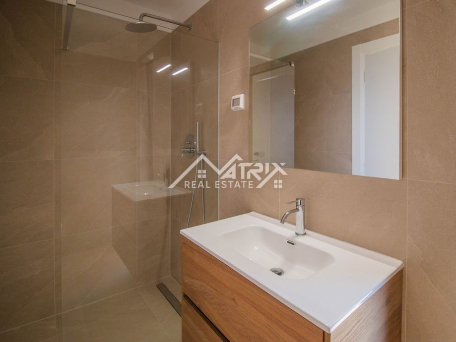 Stan se nalazi na drugom katu moderne novogradnje, a sastoji se od velikog otvorenog prostora koji objedinjuje kuhinju, blagovaonicu i dnevni boravak s izlazom na natkrivenu terasu kroz velike staklene stijene koje omogućuju obilje dnevnog prirodnog svjetla kroz cijeli dan. Sa terase se pruža prekrasan pogled na more, a uz to ima pripremljene sve instalacije za vanjsku kuhinju. Uz to, stan ima dvije spavaće sobe, dvije kupaonice, te spremište odnosno tehničku sobu.