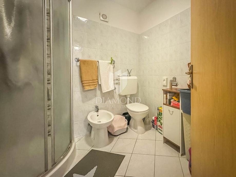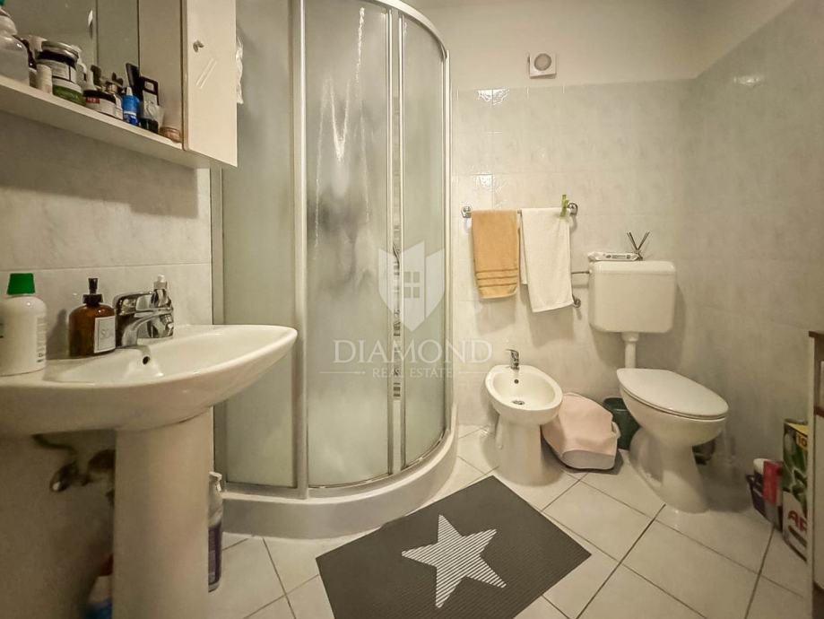 Stan je smješten na 2. katu manje grade. Ukupna površina stana od 59m2 raspodijelila se na 2 spavaće sobe, kupaonicu, spremište, kuhinju i dnevni boravak iz kojeg se izlazi na terasu sa koje se pruža predivan pogled na more. Stan je dobro održavan te u njega nije potrebno dodatno ulaganje, osim osobnih stvari koje bi ovaj stan učinile Vašim domom. Grijanje i hlađenje stana je na klima uređaj.