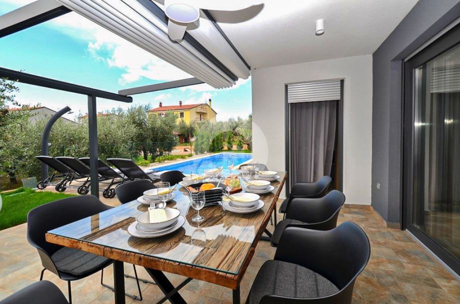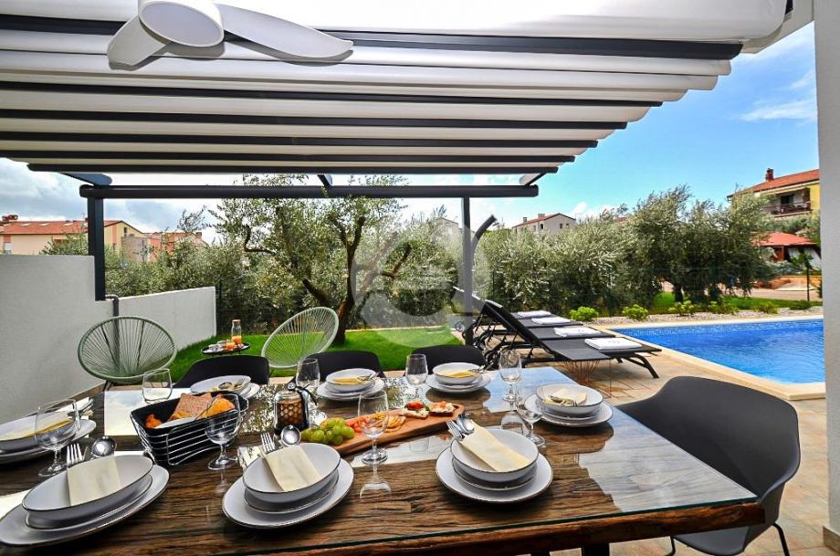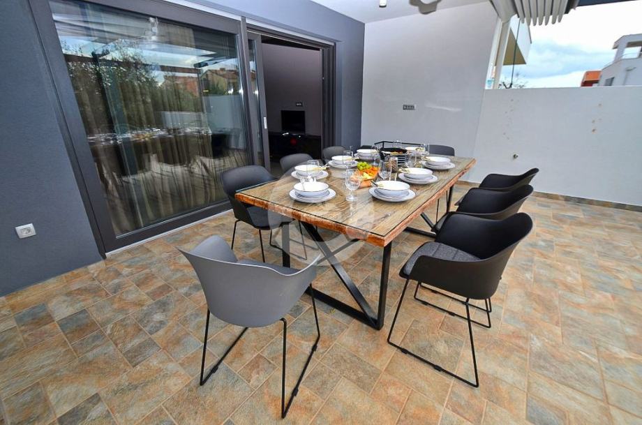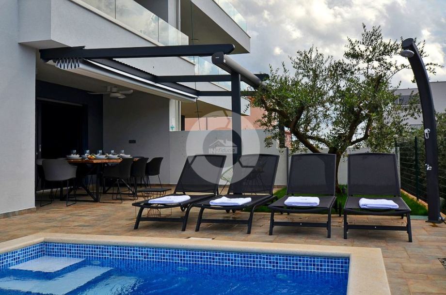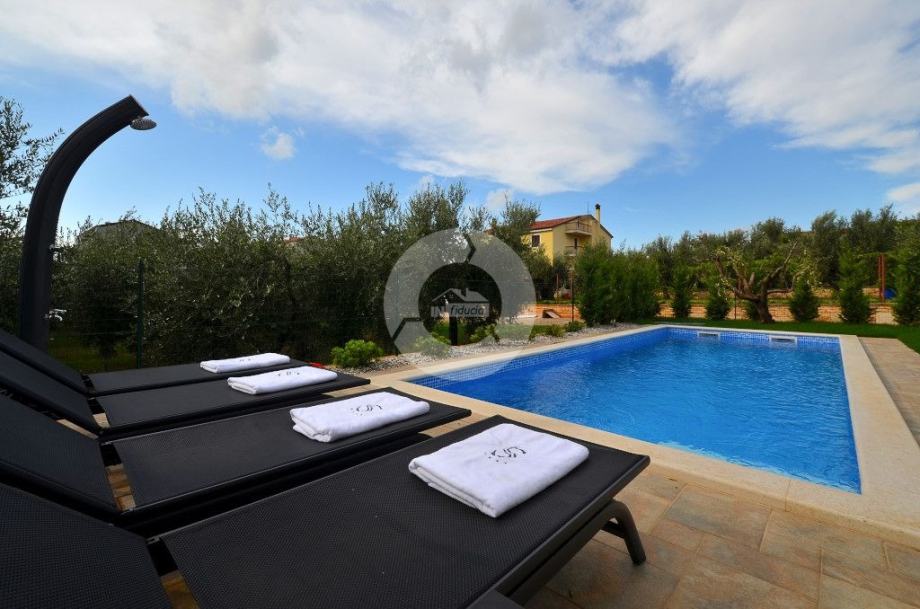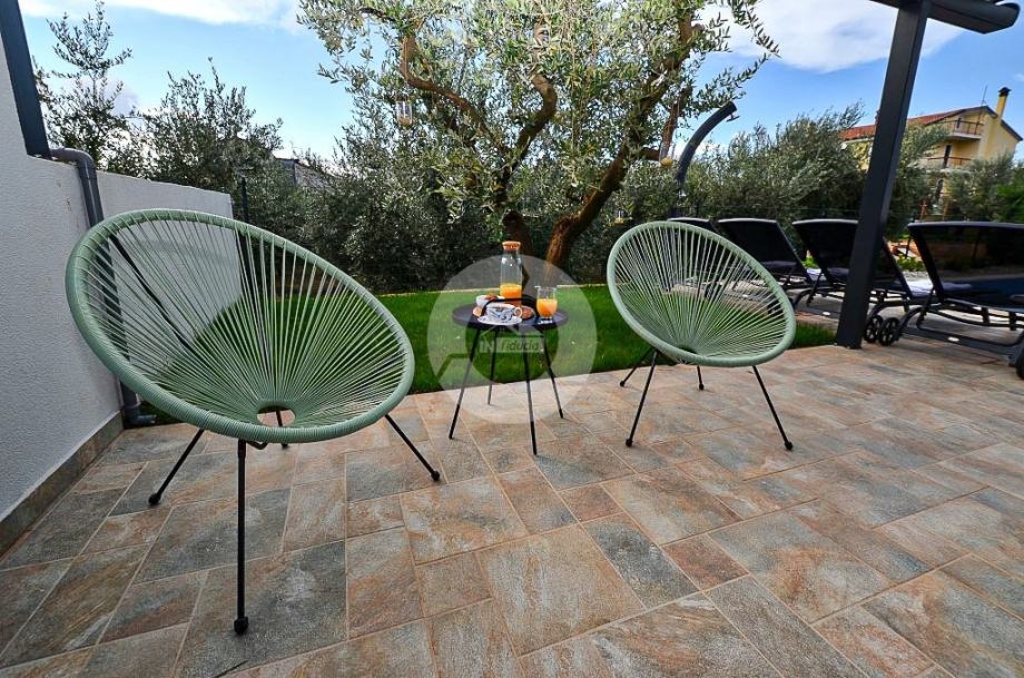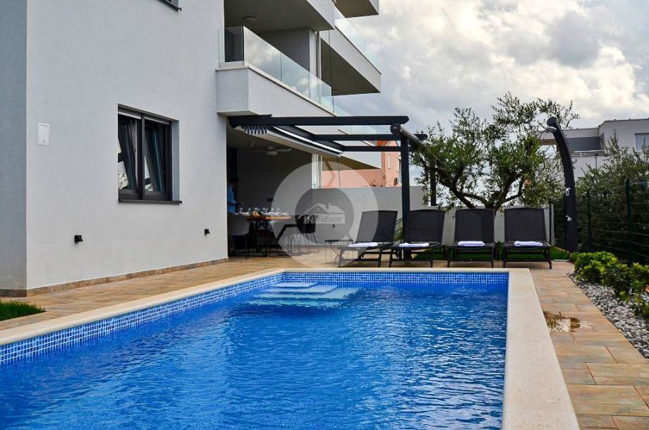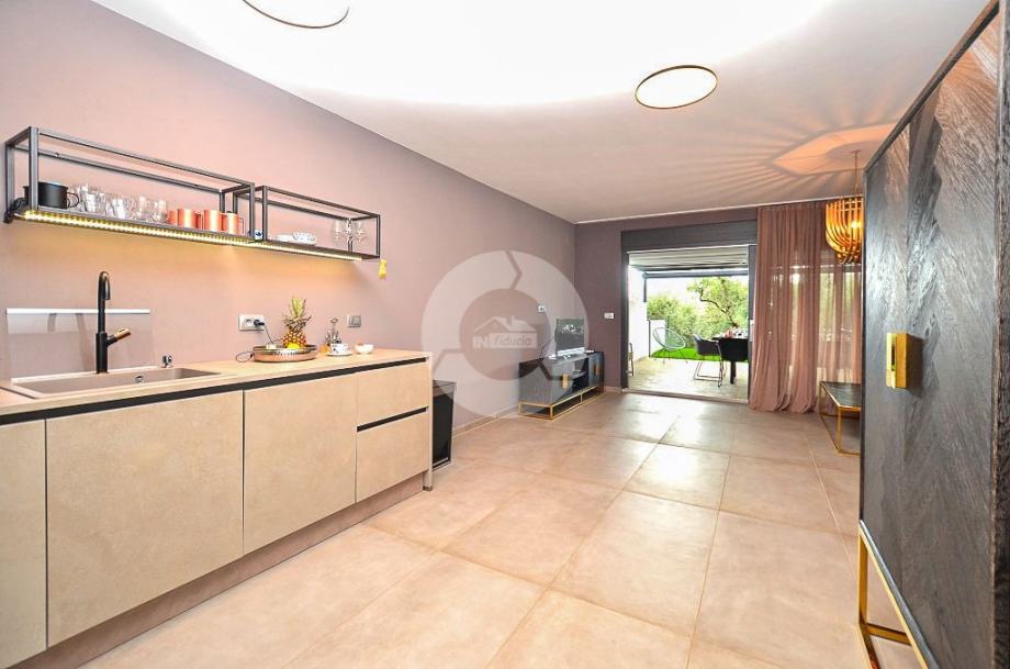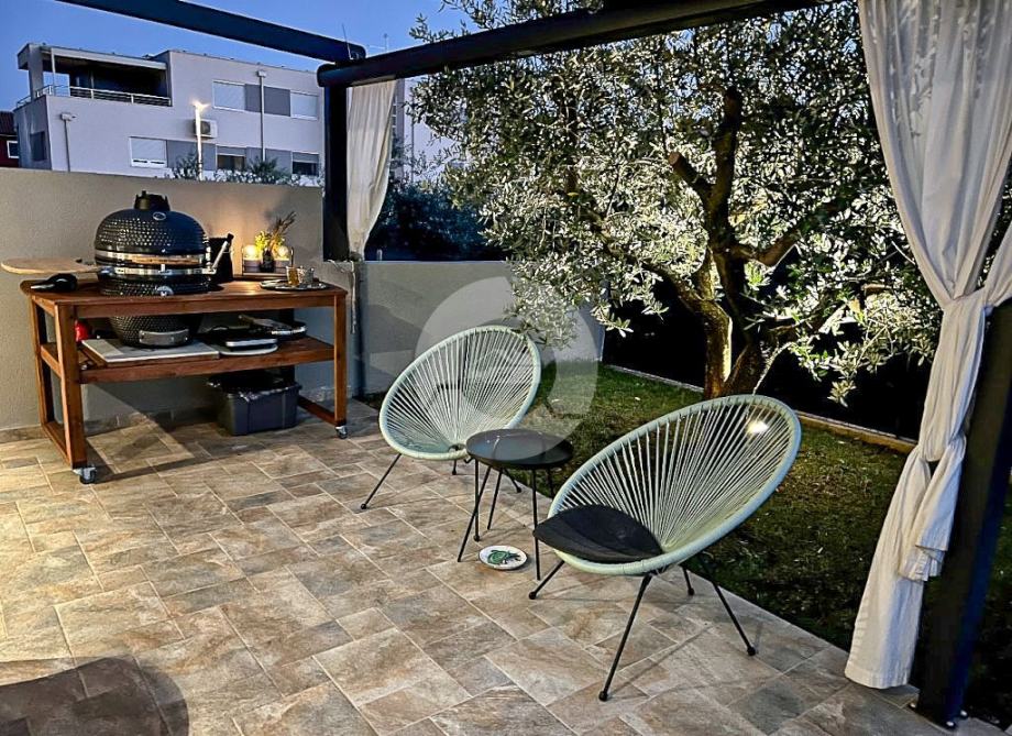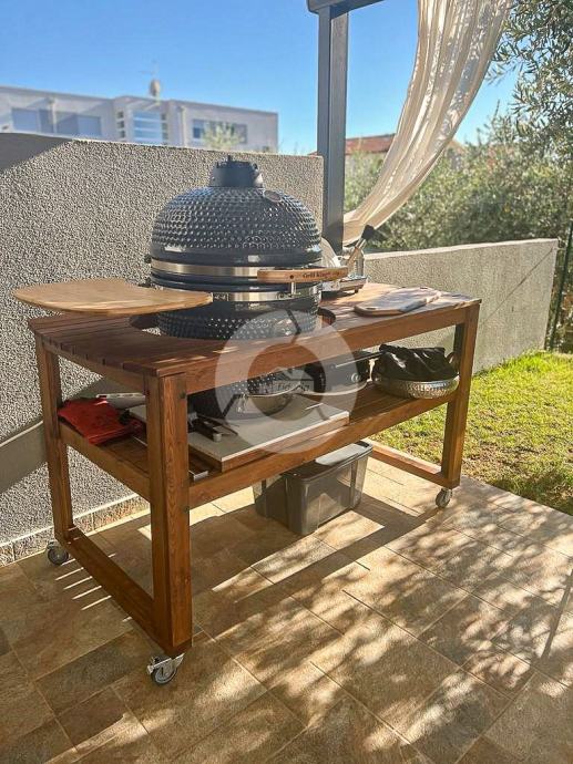 Stan se prostire na prostranoj površini te nudi tri udobne spavaće sobe. Posebno se ističe terasa, idealna za opuštanje i uživanje u svježem zraku, uz dodatnu pogodnost vlastitog vrta, ljetne kuhinje i bazena što čini ovaj stan savršenim za ljubitelje vanjskog prostora.