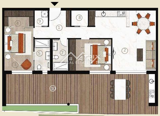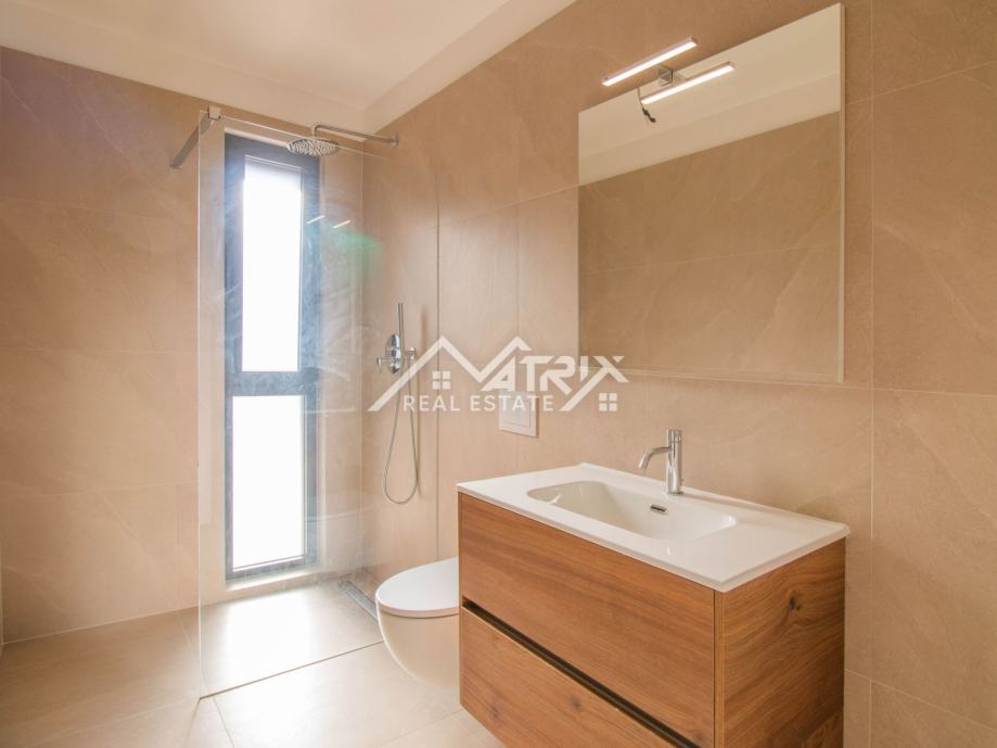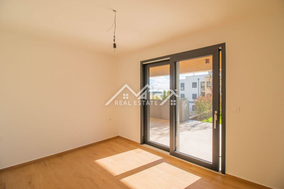 Stan se nalazi u prizemlju moderne novogradnje, a sastoji se od velikog otvorenog prostora koji objedinjuje kuhinju, blagovaonicu i dnevni boravak s izlazom na natkrivenu terasu kroz velike staklene stijene koje omogućuju obilje dnevnog prirodnog svjetla kroz cijeli dan. Sa terase se pruža prekrasan pogled na more. Uz to, stan ima dvije spavaće sobe, dvije kupaonice, te spremište odnosno tehničku sobu.
