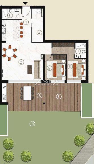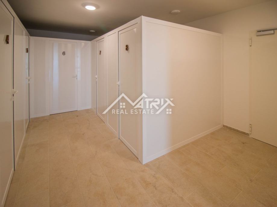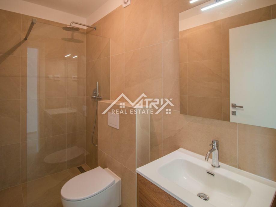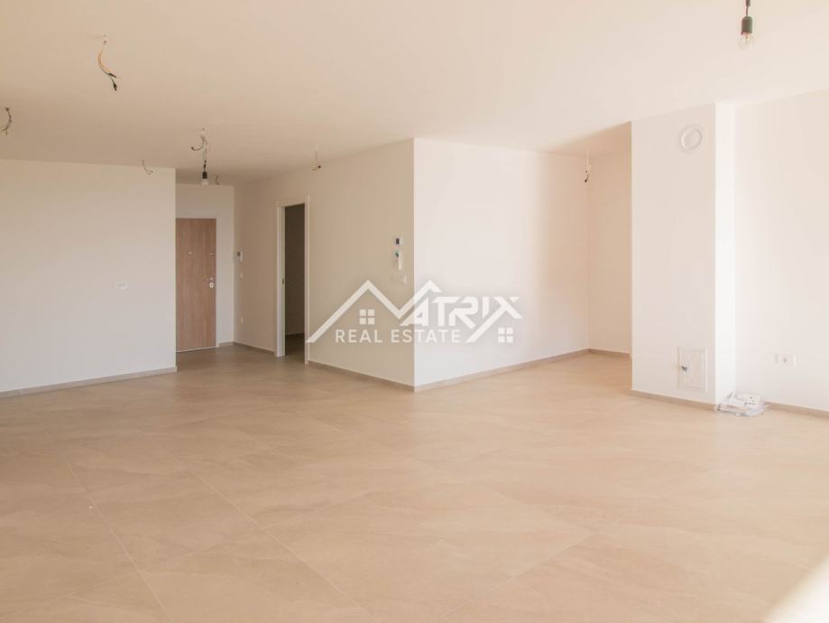 Stan se nalazi u prizemlju moderne novogradnje, a sastoji se od velikog otvorenog prostora koji objedinjuje kuhinju, blagovaonicu i dnevni boravak s izlazom na natkrivenu terasu kroz velike staklene stijene koje omogućuju obilje dnevnog prirodnog svjetla kroz cijeli dan. Sa terase se pruža prekrasan pogled na more. Uz to, stan ima dvije spavaće sobe, dvije kupaonice, te spremište odnosno tehničku sobu. Stan ima mogućnost i da se napravi dodatna spavaća soba koja je predviđena projektom.