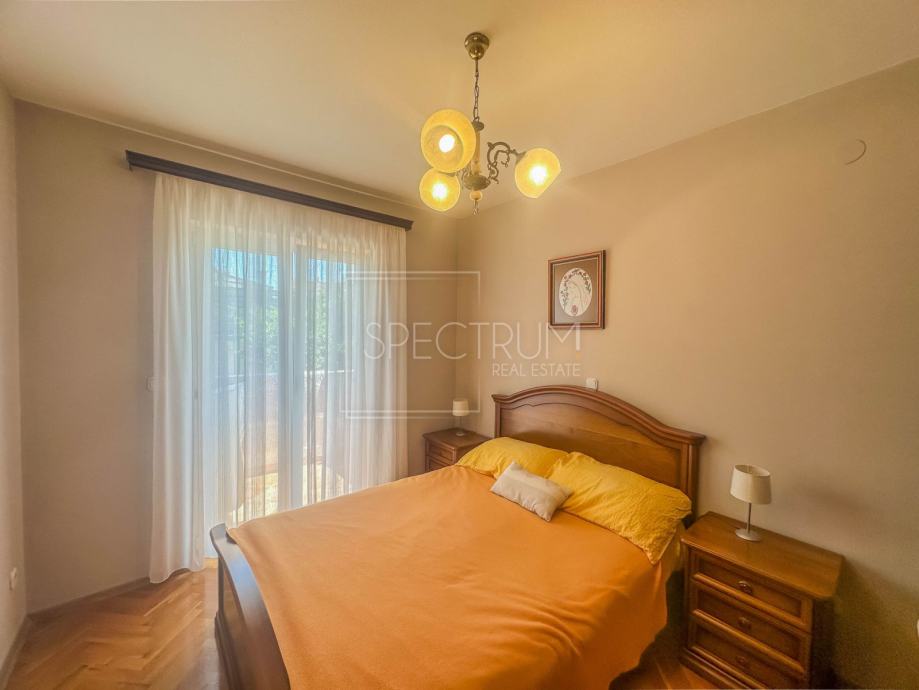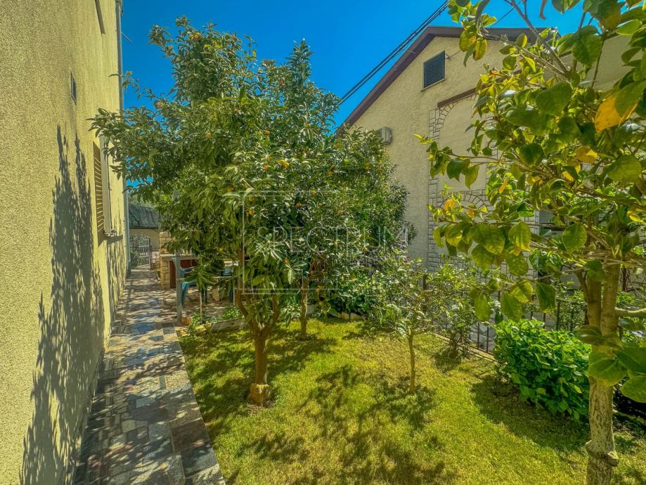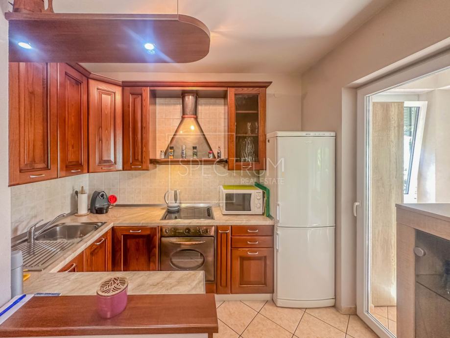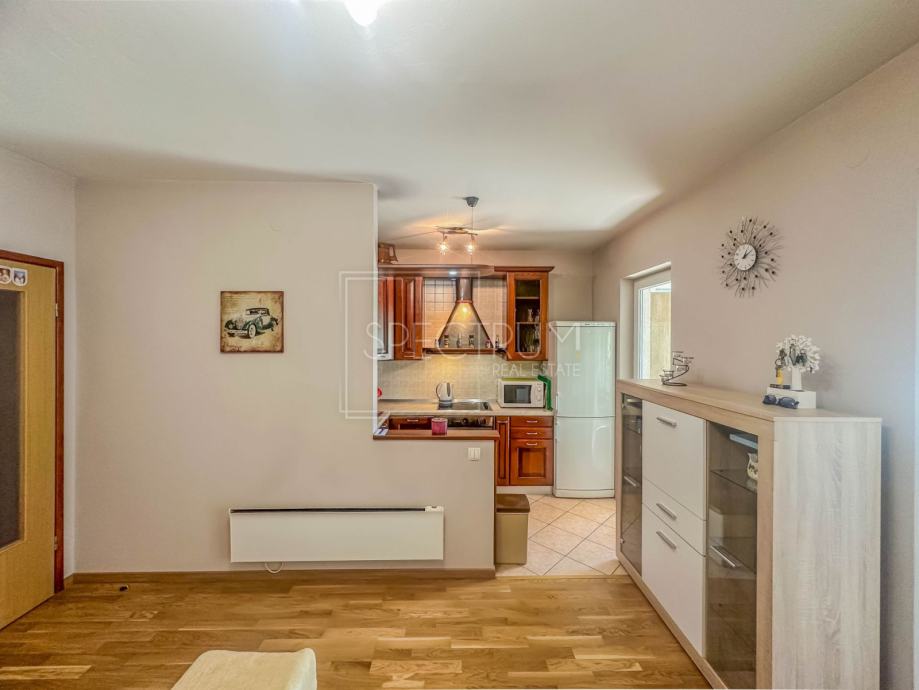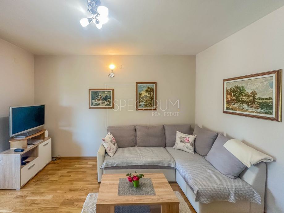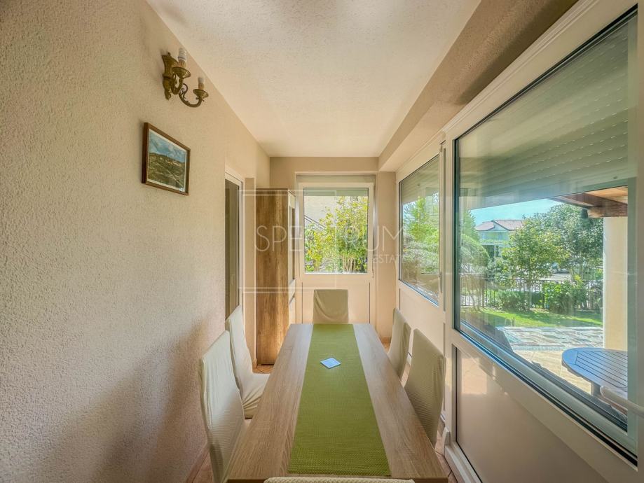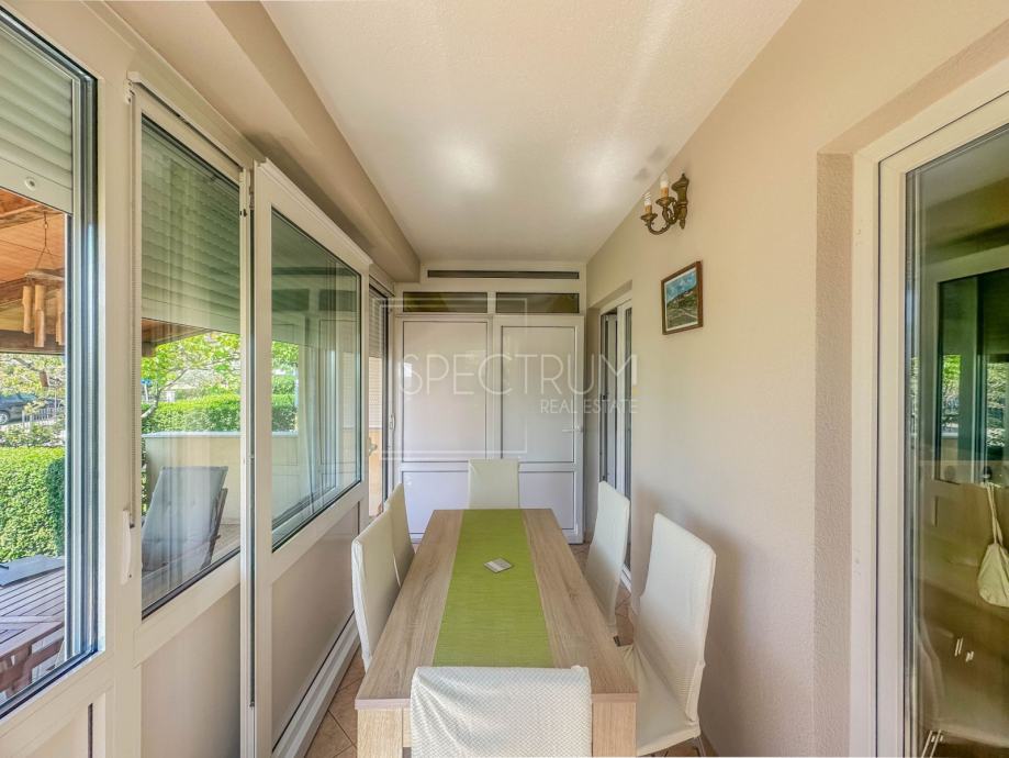 Stan se nalazi u prizemlju stambene zgrade. Površina stana iznosi 61.66 m2. Stan se sastoji od dnevnog boravka sa kuhinjom, blagovaonice, 2 spavaće sobe, hodnika, kupaonice te 2 terase. Na jednu terasu se dolazi iz spavaćih soba. Na drugu natkrivenu terasu se dolazi iz blagovaonice. Ta je natkrivena terasa idealna za uživanje u toplim ljetnim mjesecima. Stan se grije putem električnih radijatora. Stanu pripada i prostrani vrt na koji se dolazi sa natkrivene terase. U sklopu vrta se nalazi kamin i prostor za druženje na otvorenom. Pored kamina se nalazi i vrtna kućica koja može poslužiti za ostavljanje raznih alata i sličnih stvari. Vrt je uređen i održavan te ispunjen zelenilom. Odmah pored ulaza u zgrade nalazi se parking.