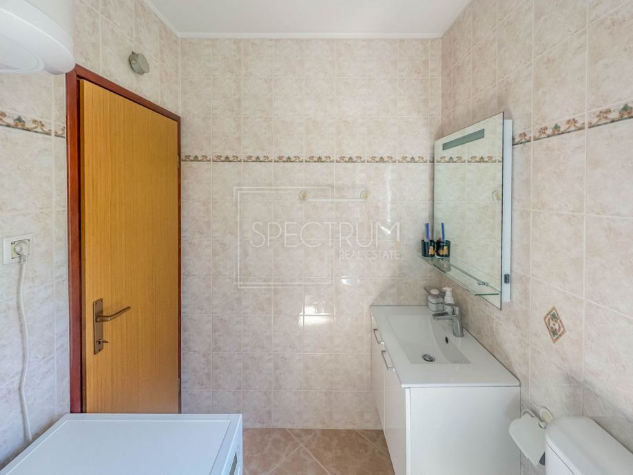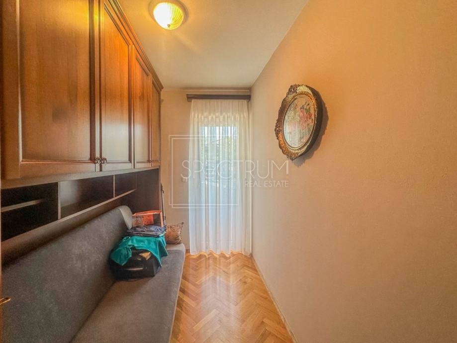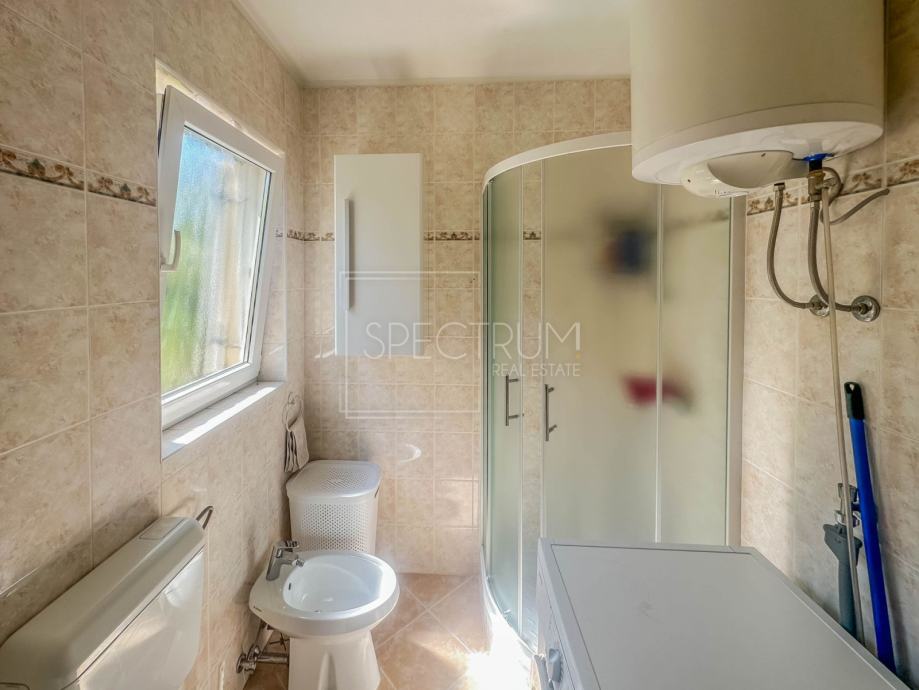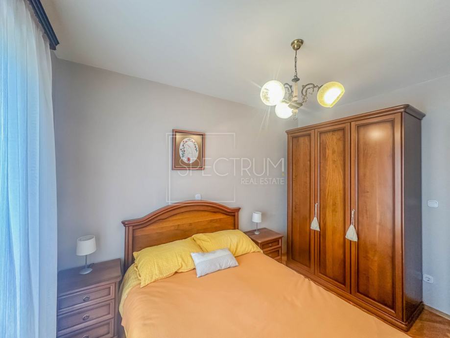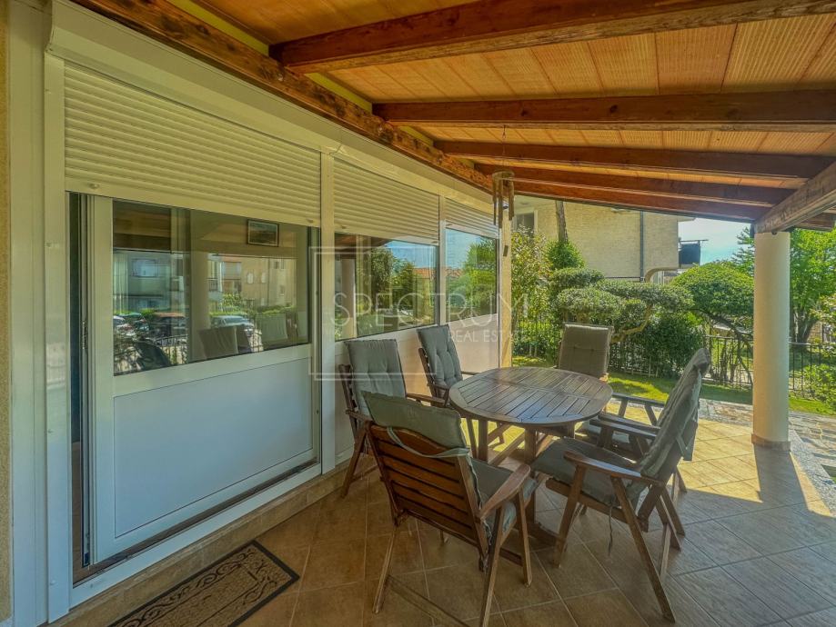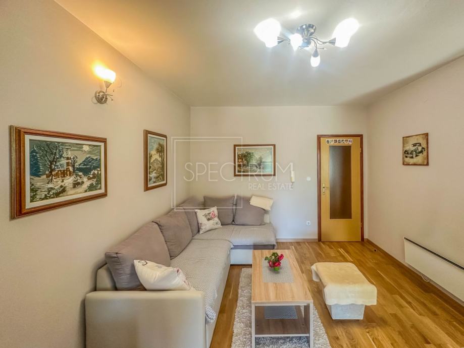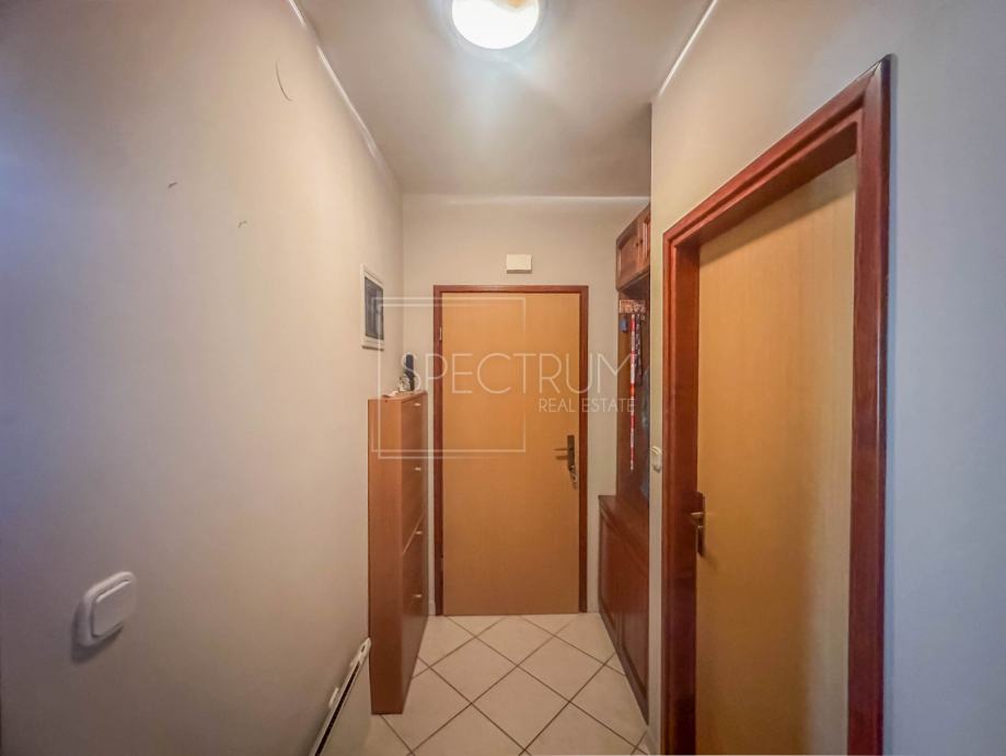 Stan se nalazi u prizemlju stambene zgrade. Površina stana iznosi 61.66 m2. Stan se sastoji od dnevnog boravka sa kuhinjom, blagovaonice, 2 spavaće sobe, hodnika, kupaonice te 2 terase. Na jednu terasu se dolazi iz spavaćih soba. Na drugu natkrivenu terasu se dolazi iz blagovaonice. Ta je natkrivena terasa idealna za uživanje u toplim ljetnim mjesecima. Stan se grije putem električnih radijatora. Stanu pripada i prostrani vrt na koji se dolazi sa natkrivene terase. U sklopu vrta se nalazi kamin i prostor za druženje na otvorenom. Pored kamina se nalazi i vrtna kućica koja može poslužiti za ostavljanje raznih alata i sličnih stvari. Vrt je uređen i održavan te ispunjen zelenilom. Odmah pored ulaza u zgrade nalazi se parking.
