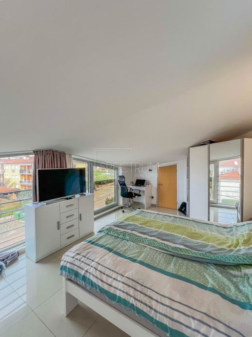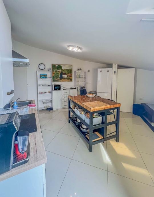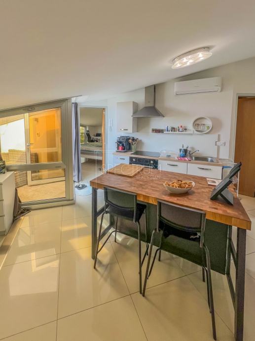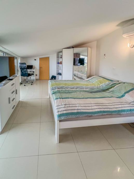 Stan se nalazi na 3.katu, ujedno i potkrovlju stambene zgrade sa liftom. Površina stana iznosi 40.65 m2. Stan se sastoji od dnevnog boravka zajedno sa kuhinjom i blagovaonicom, spavaće sobe, kupaonice, ostave i krovne terase. Sa krovne terase se pruža pogled na more i grad Novigrad. Raspored prostorija je jako dobar te je praktički svaki dio stana pametno iskorišten. Stan se grije putem klima uređaja. U vlasništvu stana je i parkirno mjesto koje se nalazi odmah pored ulaza u zgradu.