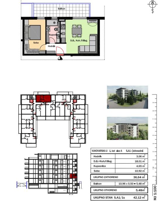● jednosoban stan ukupne površine 42,12 m2 (A1)