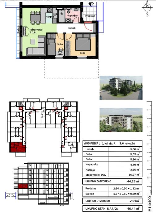 ● dvosoban stan ukupne površine 46,44 m2 (A4)