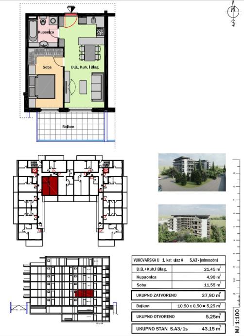 ● jednosoban stan ukupne površine 43,15 m2 (A3)