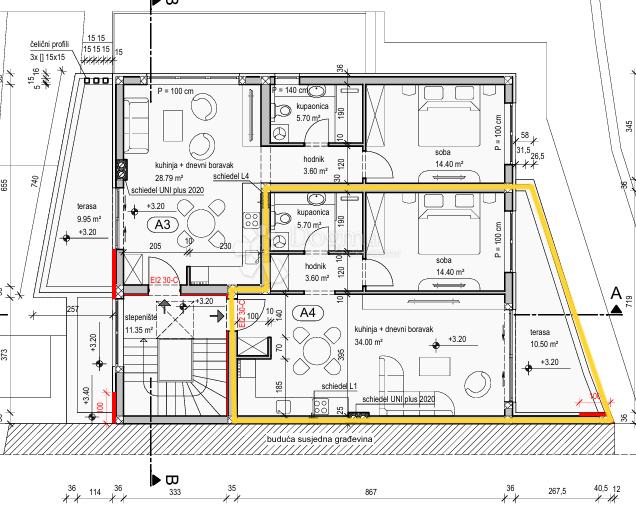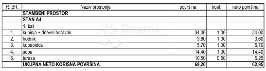 Stan “A4” smješten u prizemlju, ukupne netto površine sa koeficijentima 62.95 m² sa izvrsno osmišljenim rasporedom: