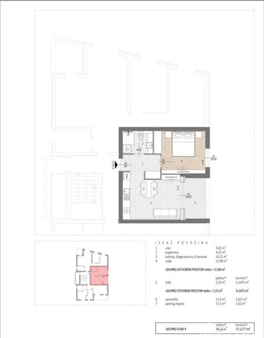 Stan je projektiran za ugodan i praktičan svakodnevni život.Sastoji se od:ulaznog hodnika,kupaonice,spavaće sobe,kuhinje s blagovaonicom,prostranog dnevnog boravka, lođe, spremišta i dva parkirna mjesta