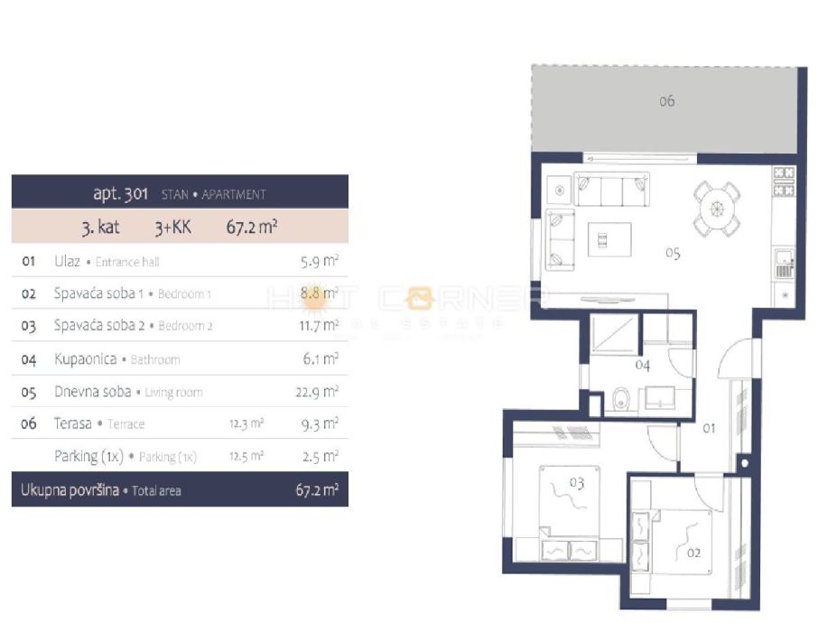 Stan na 2. katu oznake "301" sastoji se od ulaznog prostora, 2 spavaće sobe, kupaonice, "open