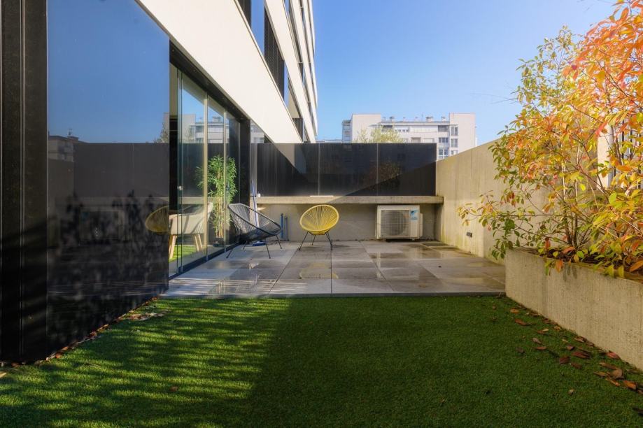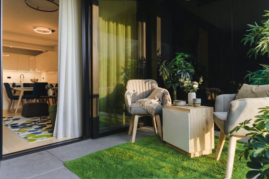 Vanjski prostor je ograđen i pripada isključivo stanu, kombinira zelenu površinu i popločani dio za odmor i pripremu roštilja.