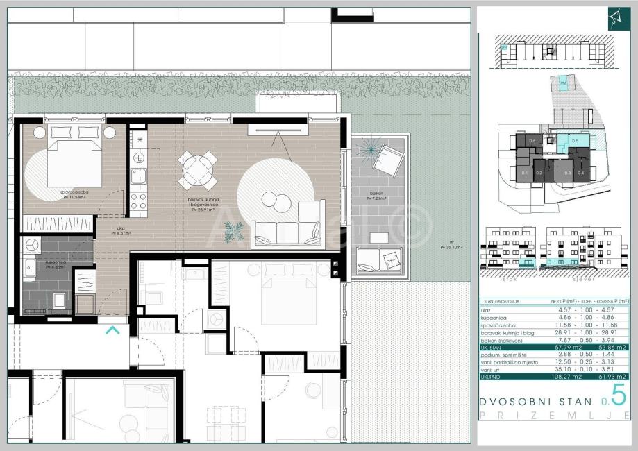 Stan oznake 0.5 nalazi se u prizemlju zgrade i ima ukupnu netto stambenu površinu 53.86 m2 a sastoji se od ulaznog prostora/hodnika, kuhinje sa blagovaonicom i dnevnim boravkom, sobe, kupaonice i natkrivenog balkona.