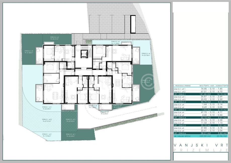 Pripadci stanu su: VRT 35.10 m2 (obračunske površine 3.51 m2), vanjsko parkirališno mjesto PM0.5. - 12.50m2 (obračunske površine 3.13 m2) i spremište SPR0.5.od 2.88 m2 (obračunske površine 1.44m2) u podrumu zgrade.
