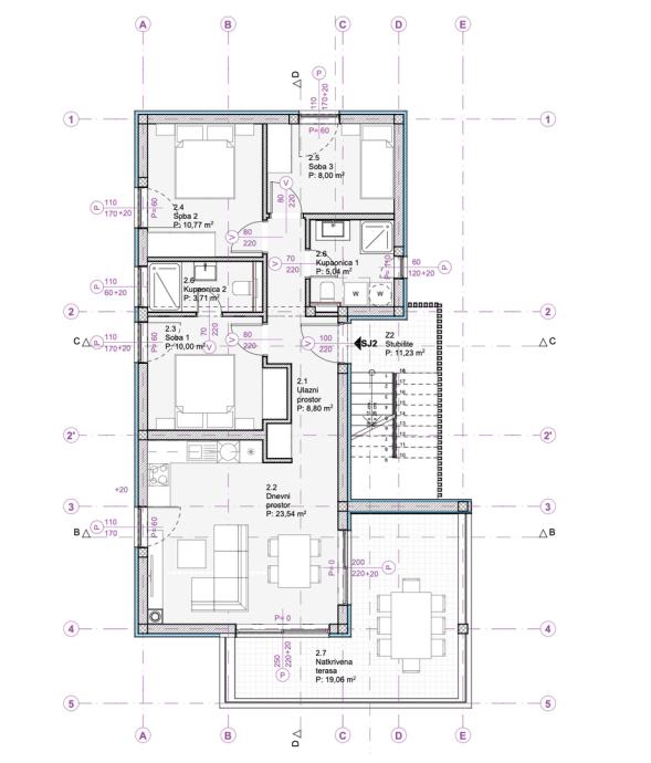 Stan S2 nalazi se na 1. katu zgrade. Prostire se na 89,42 m2 obračunske / prodajne površine. Od toga 69,86 m2 otpada na unutarnju stambenu kvadraturu stana + 19,06 m2 tlocrtne površine natkrivene terase + spremište br. 3 tlocrtne površine 12,66 m2 te čak 2 vanjska parkirna mjesta P1 i P6, sveukupno po koeficijentu ispada 89,42 m2.
