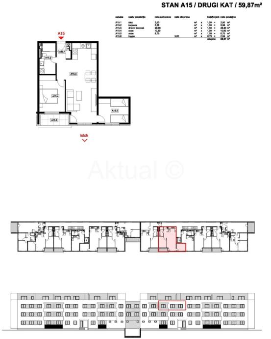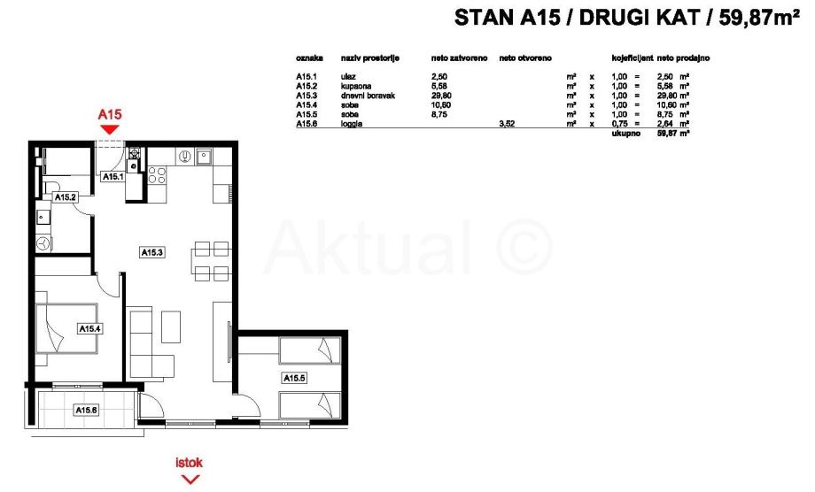 Stan oznake A15 nalazi se na II-katu zgrade, ukupne površine 59.87 m2 a sastoji se od ulaznog prostora/hodnika, kuhinje sa blagovaonicom i dnevnim boravkom,dvije sobe, kupaonice i loggie.