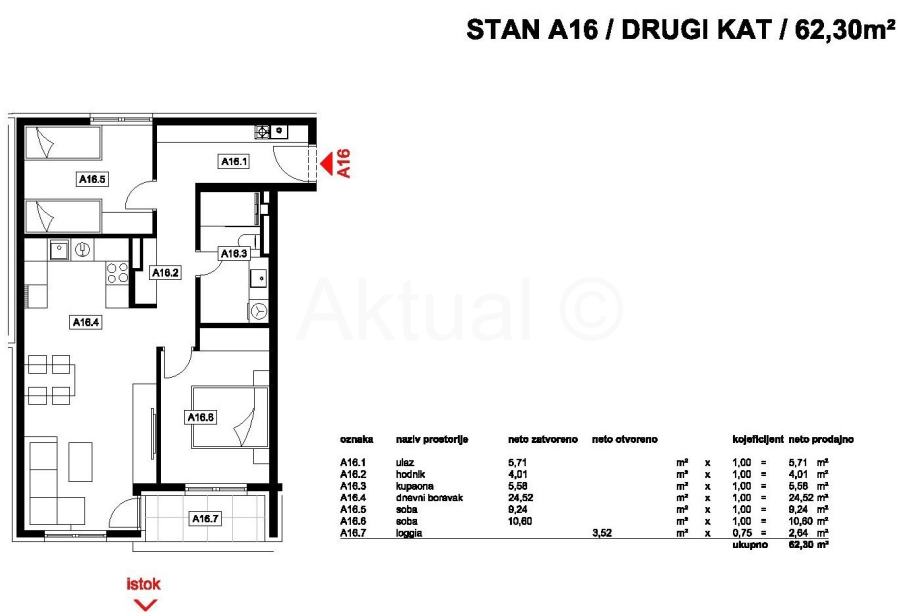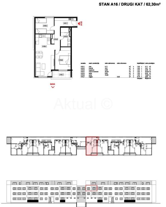 Stan oznake A16 nalazi se na II-katu zgrade, ukupne površine 62.30 m2 a sastoji se od ulaznog prostora/hodnika, kuhinje sa blagovaonicom i dnevnim boravkom,dvije sobe, kupaonice i loggie.