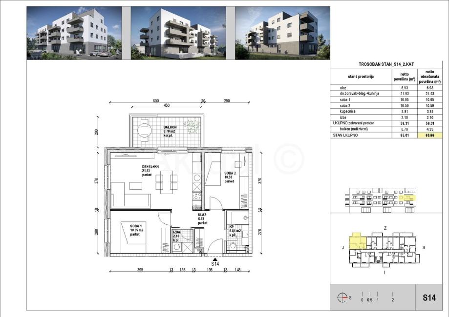 Stan oznake S14 nalazi se na II-katu zgrade, ukupne površine 60.66 m2 a sastoji se od ulaznog prostora/hodnika, kuhinje, blagovaonice i dnevnog boravka, 2 sobe, kupaonice, izbe i natkrivenog balkona.