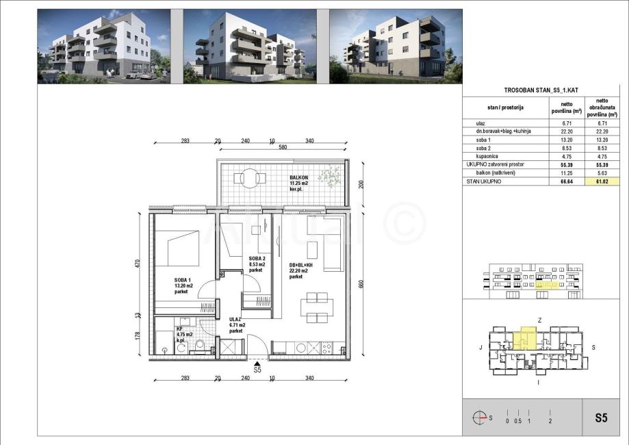 Stan oznake S5 nalazi se na I-katu zgrade, ukupne površine 61.02 m2 a sastoji se od ulaznog prostora/hodnika, kuhinje, blagovaonice i dnevnog boravka, 2 sobe, kupaonice i natkrivenog balkona.