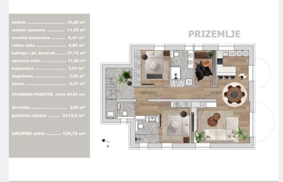 Stanu pripadaju 2 natkrivena parkirna mjesta (2x12,5 m2) i vrt površine 230 m2.