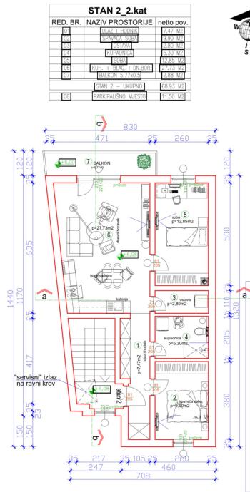 Trosoban stan od 69 m² se nalazi na 2. katu objekta sa 2 stana. Stan dolazi sa vanjskim spremištem u prizemlju (cca 4,5 m²), koje se prodaje po cijeni od 50% cijene kvadrata.