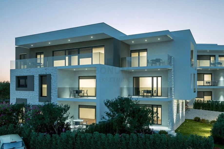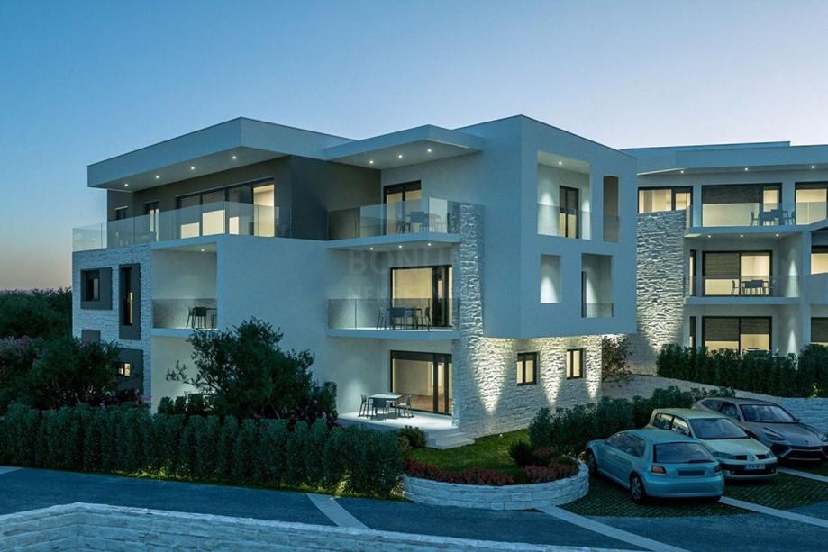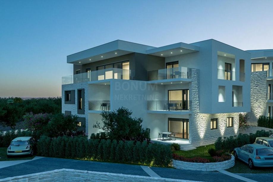 Prodaje se novi moderan apartman u prizemlju (AP2) s dvorištem blizu plaže. Apartman je smješten u prizemlju i sastoji se od ulaznog hodnika, dvije spavaće sobe, kupaonice, toaleta, te dnevnog boravka s kuhinjom i blagovaonicom u jednoj cjelini s izlazom na terasu i dvorište.