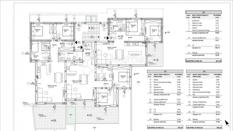 Stan S1 ukupne neto kvadradure 87,61 m2 trosoban je stan 70,84 m2 sa vrtom od 105,75m2 koji čini pravu mediteransku oazu za Vaš idealan odmor.