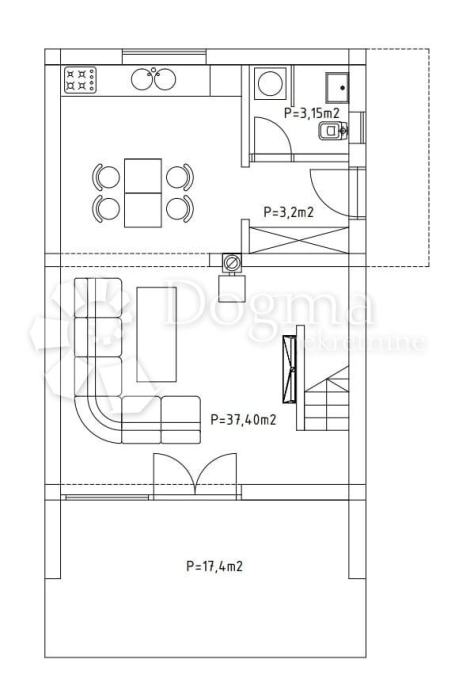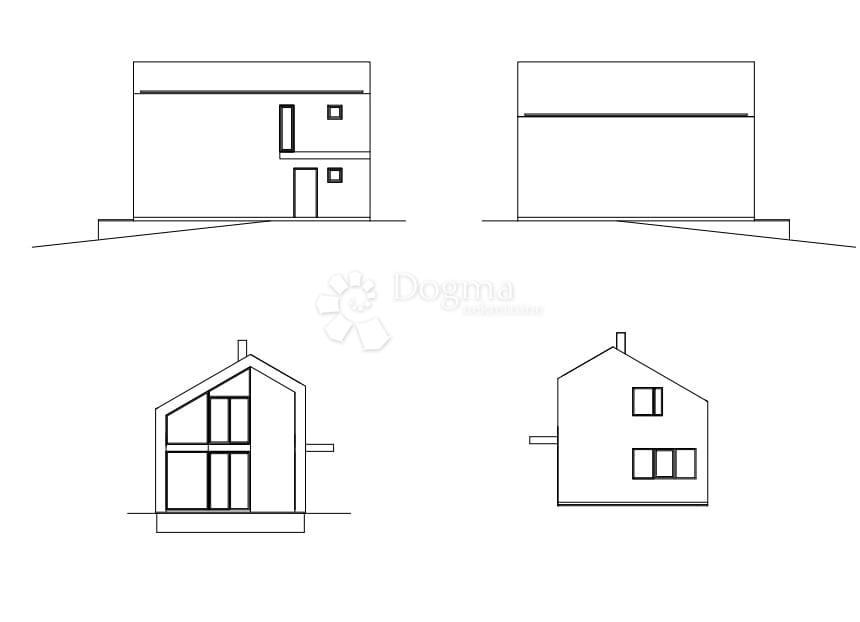 Ovdje prodajemo više građevinskih terena sa projektima kućica koje su u biti dvoetažni stanovi od cca 100 m2. Na prizemlju je kuhinja sa blagovaonom, dnevnim boravkom i wc-om i lijepom terasom ispred, a na katu su dvije spavaće sobe i kupaonica.