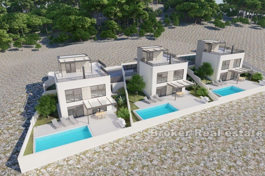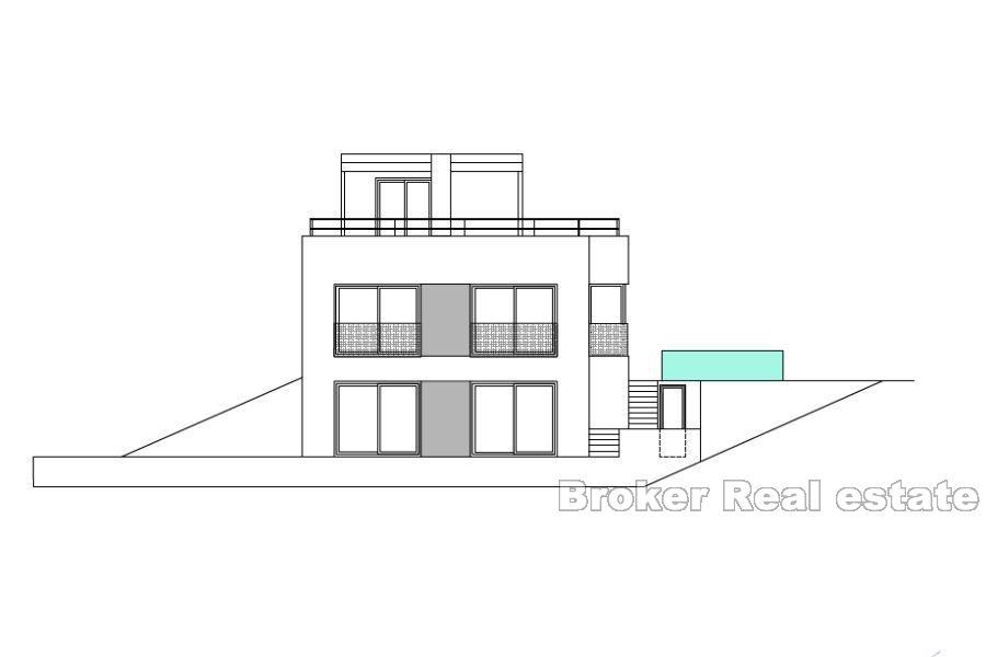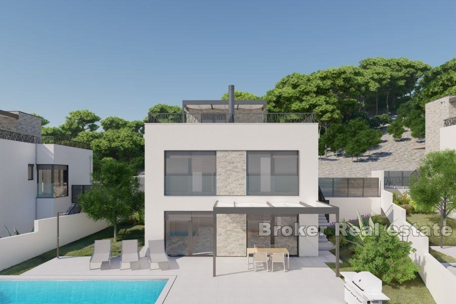 Nekretnina se nalazi na zemljištu veličine 407 m2 sa privatnim pristupnim putem i pristupom cijeloj infrastrukturi. Stambena površina nekretnine je 190 m2 te se sa svake etaže pruža otvoreni panoramski pogled prema moru i okolini. Zemljište se sastoji od parkinga, bazena, terase i uređenog okoliša. Kuća se proteže na dvije etaže, prizemlje i kat s izlazom na krovnu terasu. Na prizemlju se nalaze kuhinja i blagovaonica, dnevna soba te zajednički toalet. Unutarnje stepenište vodi do gornje etaže gdje se nalaze tri prostrane spavaće sobe, svaka sa svojom kupaonicom.