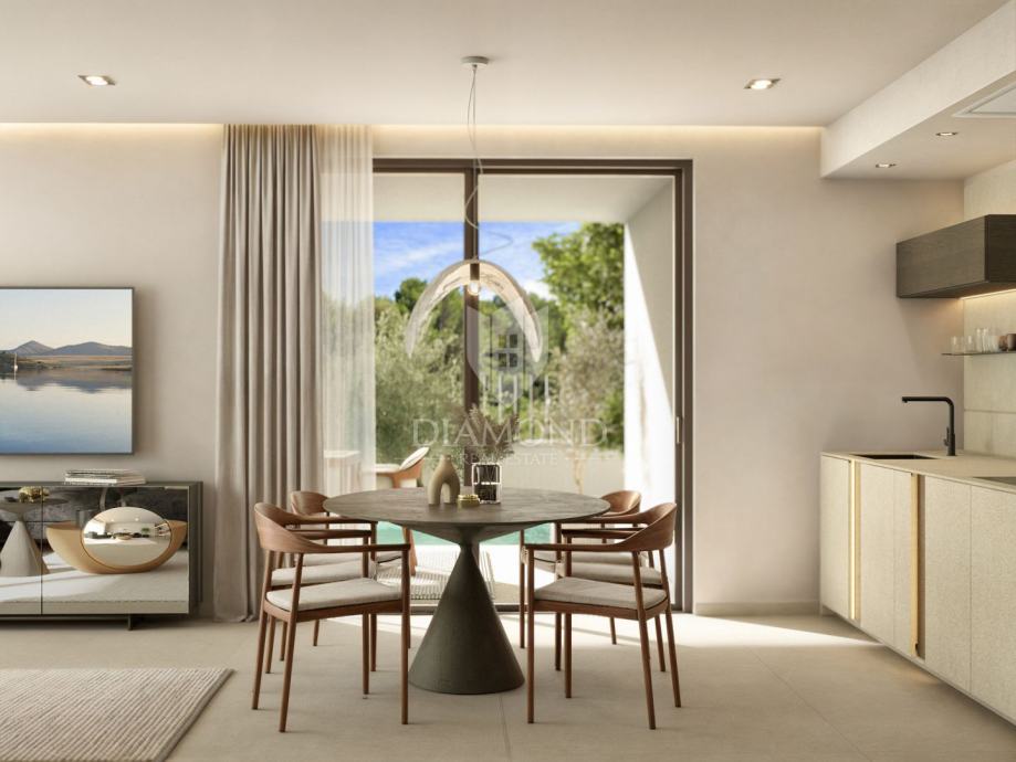 Unutrašnjost stana je pažljivo osmišljena, nudeći tri prostrane spavaće sobe, od kojih dvije imaju vlastite kupaonice. Dodatni WC, opremljen modernim sustavom električnog podnog grijanja, osigurava ugodnu toplinu i komfor. Stan krase toplinski izolirane staklene stijene s dvoslojnim staklom, koje propuštaju obilje prirodne svjetlosti i pružaju prekrasan pogled na privatni vrt i preljevni bazen površine 28 m².