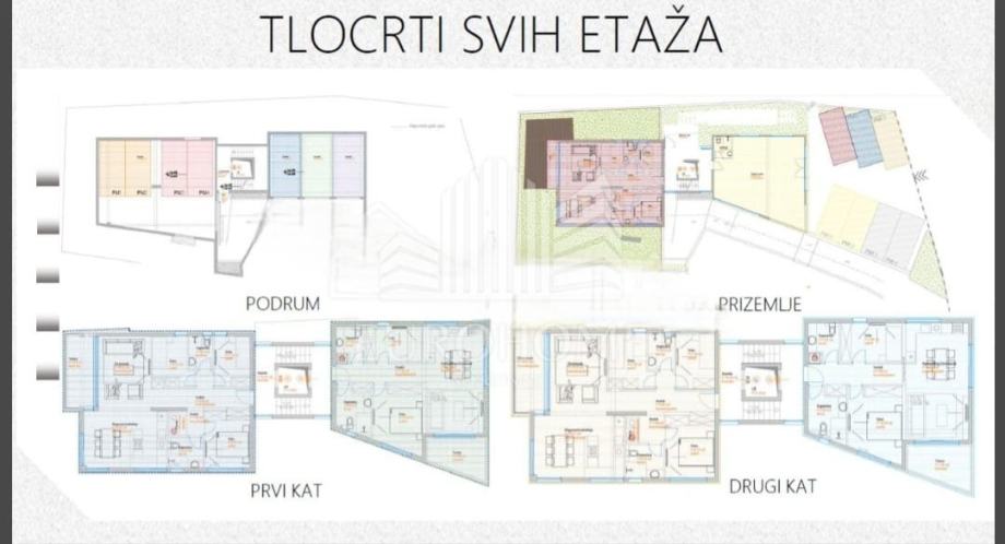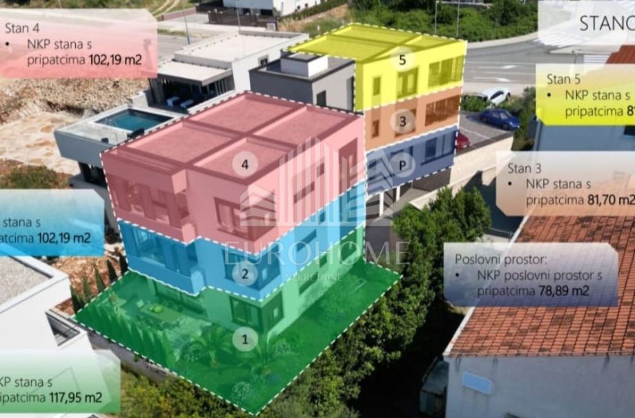 Samostojeća stambena zgrada sastoji od prizemlja i dva kata, odnosno 5 stambenih jedinica i jednim poslovnim prostorom. U ponudi su 2-sobni i 3-sobni stanovi. Stanovi površina od 79 m2 do 118 m2 projektirani za ugodan obiteljski život sa idealnim tlocrtima. Svi stanovi posjeduju po dva parkirna mjesta( jedno u garaži i jedno vanjsko PM) . Zgrada će imati i lift koji se proteže od podruma( garaže) do drugog kata. Dodatno se komunikacija odvija stubištem od podruma do drugog kata.