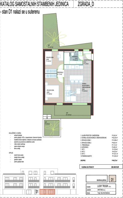 Prodaje se stan D1 u novom stambenom projektu u samom centru Trogira. Stan se nalazi u suterenu zgrade D i prostire se na 95,27 m², uključujući tri privatna vrta ukupne površine 32,84 m², što osigurava dodatni komfor i privatnost u mirnom okruženju.