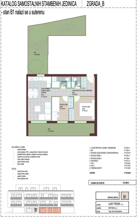 Prodaje se stan B1 u novom stambenom projektu u samom centru Trogira. Stan se nalazi u suterenu zgrade B i prostire se uz dva privatna vrta na 105,98 m².