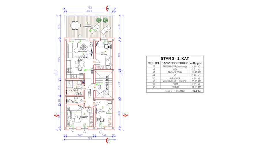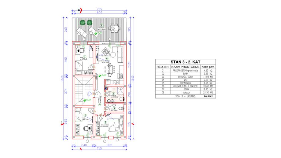 Četverosoban stan ukupne netto površine 80.5 m2 nalazi se na drugom katu.