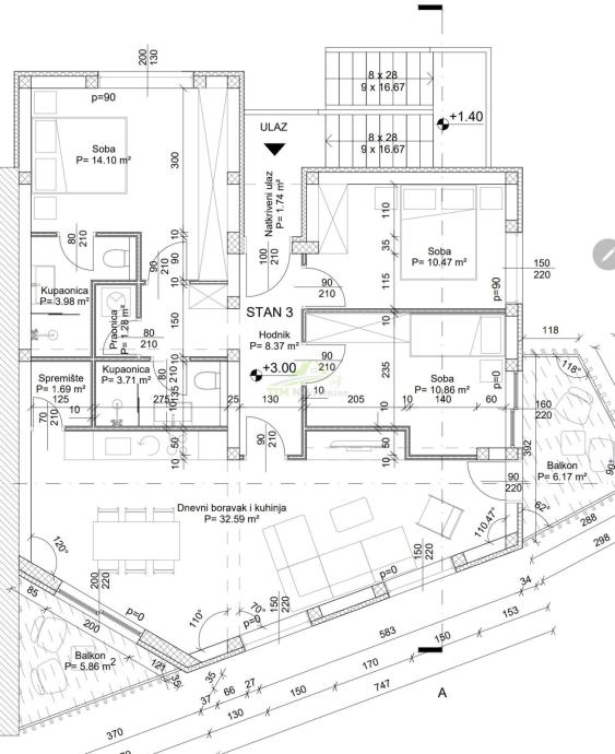 RASPORED STANA:- kuhinja sa blagovaonicom i dnevnim boravkom-spavaća soba I- spavaća soba II- spavaća soba III- kupaonica I - kupaonica II- hodnik- balkon I - balkon II- spremište- praonica