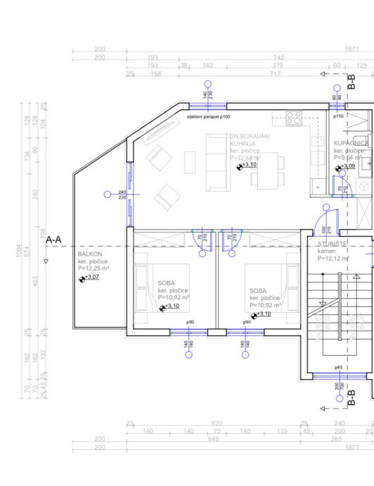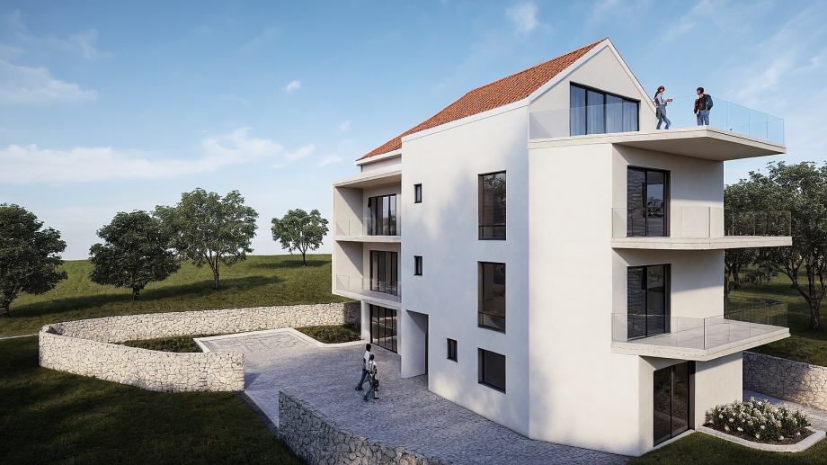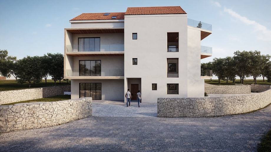 Stan se sastoji od kuhinje i dnevnog boravka, dvije spavaće sobe te kupaonice. Prostrani balkon s pogledom na šumu i more.
