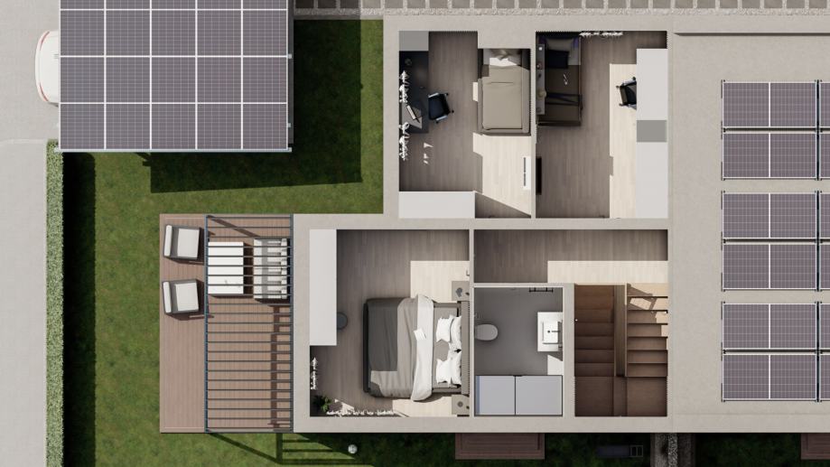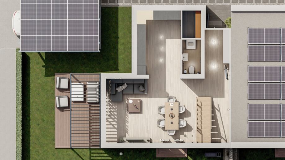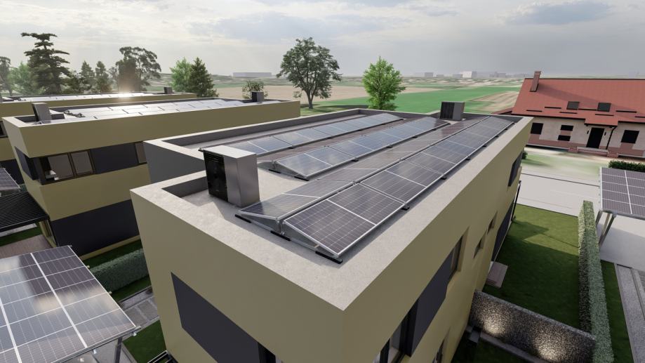 Fotonaponski sustav: Svaka stambena jedinica opremljena je solarnim sustavom snage od 11 kW, uključujući panele na krovu i parkirnoj nadstrešnici. Ukupno po objektu 22 kW.